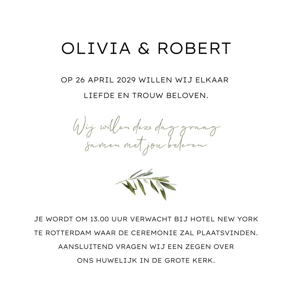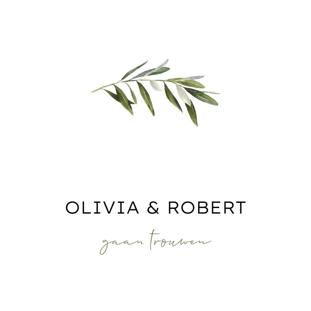 Witte trouwkaart met geschilderd eucalyptus takje. Ben je op zoek naar een trendy en stijlvolle trouwkaart zonder al te veel poespas? Dan is dit jouw kaart. Het ontwerp heeft een elegant eucalyptus takje op de voorzijde. In de kaart is er ruimte voor alle overige informatie. In onze handige ontwerptool kun je de kaart helemaal personaliseren.