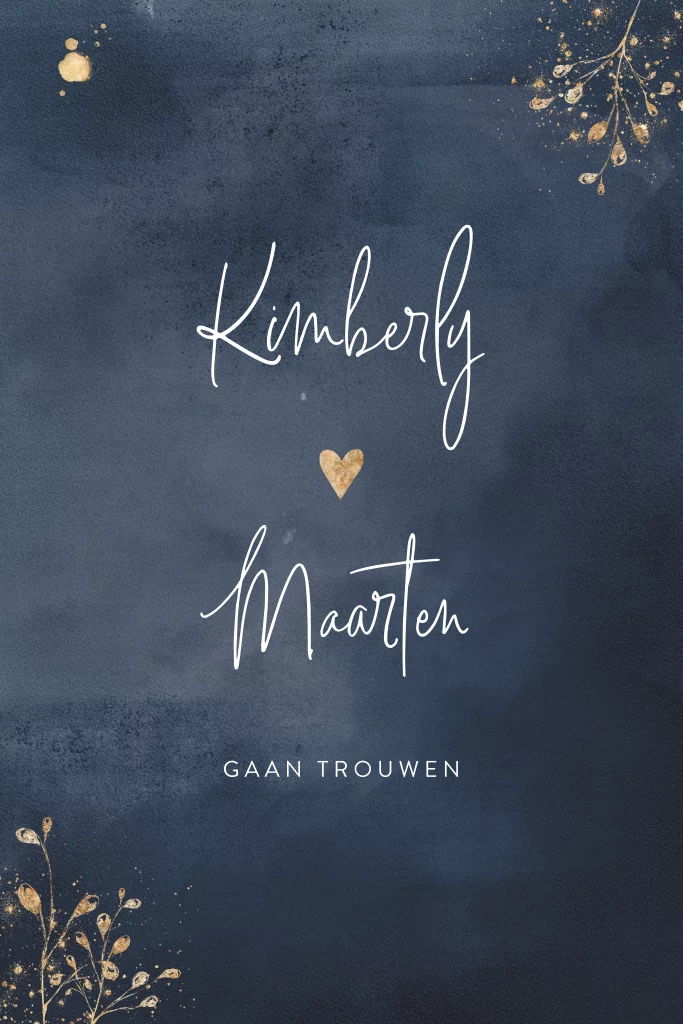 Donkerblauwe trouwkaart met goudkleurige blaadjes en spetters. Supermooie trouwkaart op staand, dubbel formaat. De kaart heeft prachtige diepblauwe waterverf op de voorzijde en wordt versierd met goudkleurige spetters. Met een hip lettertype staan jullie namen voorop de kaart. In de kaart is ruimte voor jullie dagprogramma en alle overige informatie.
