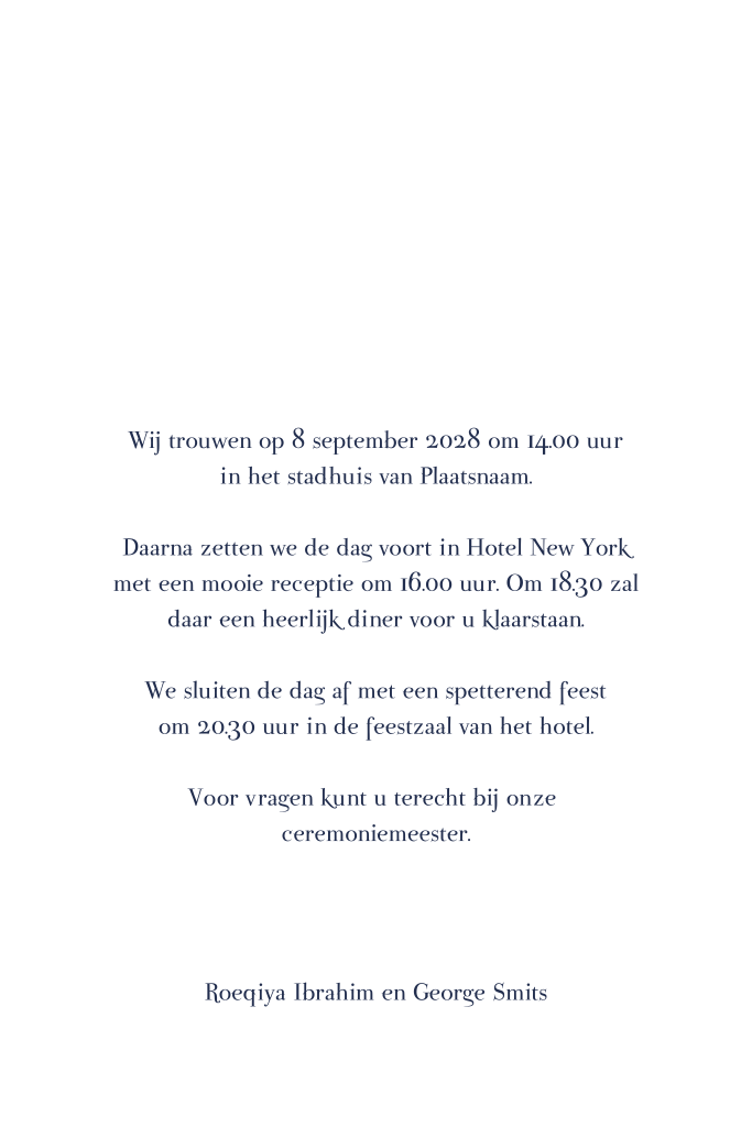 Strakke trouwkaart in donkerblauwe kleur met goudfolie opdruk. In glimmend goud komen jullie initialen voorop te staan, versierd door een krans van goudfolie blaadjes. Aan de binnenzijde is genoeg ruimte voor de details over jullie trouwdag. Liever een andere kleur? Pas deze trouwuitnodiging zelf aan in onze editor en bestel een proefdruk.
