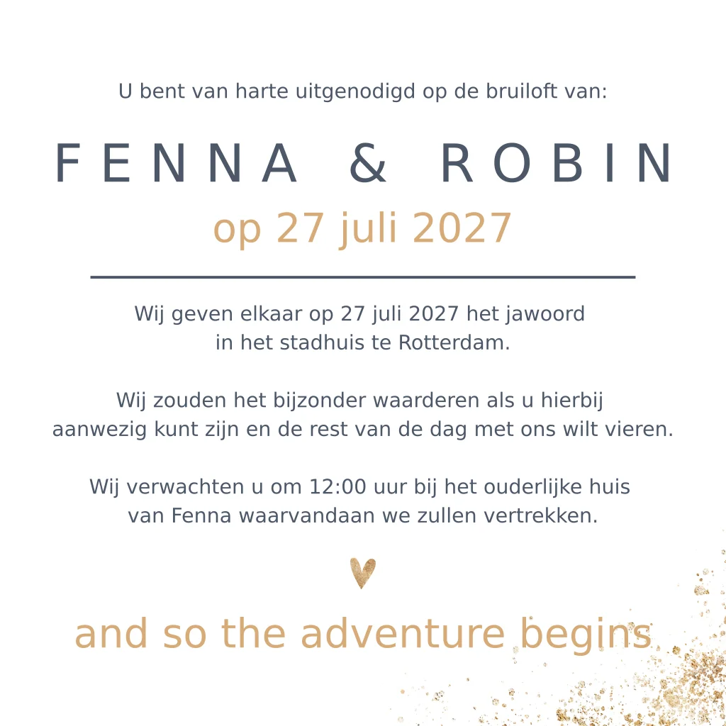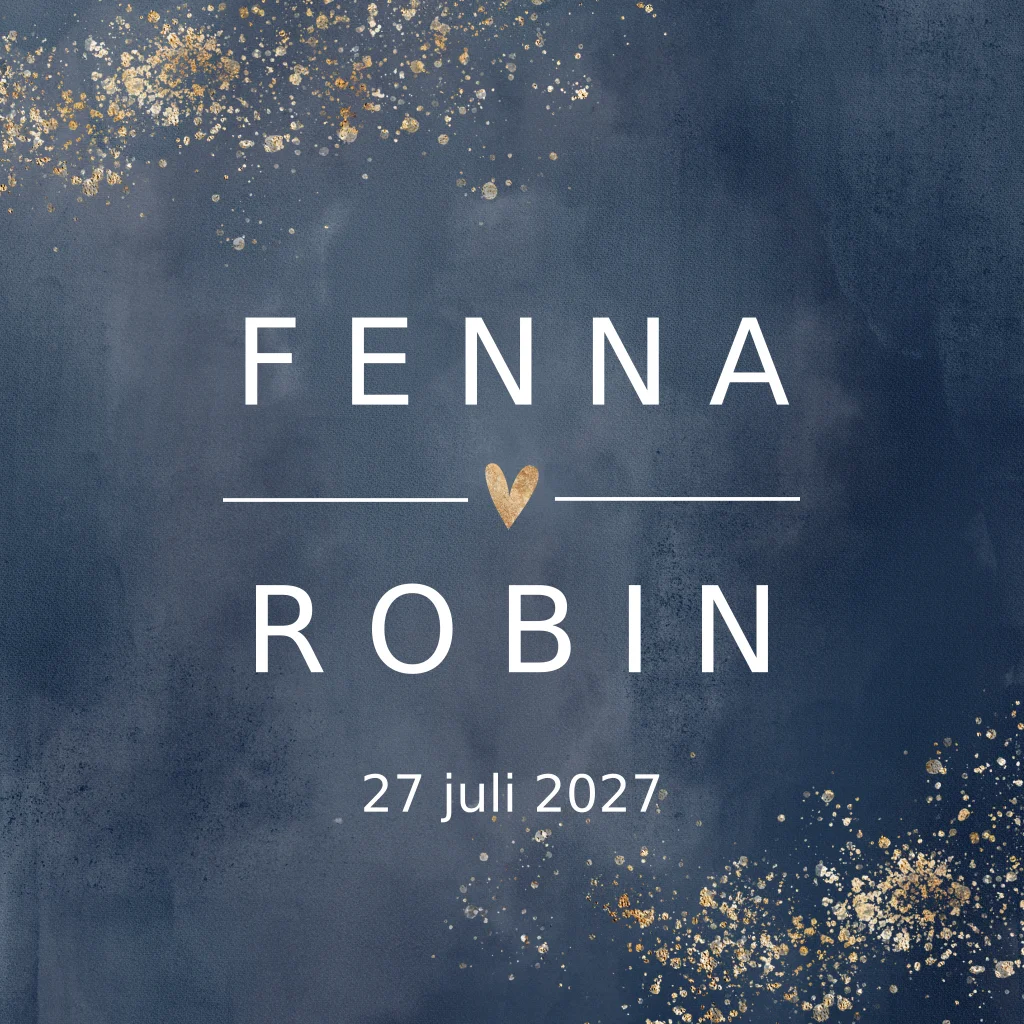 Trouwkaart met donkerblauwe waterverf en goudkleurige spetters. Dat deze stijl populair is blijkt wel uit de vele varianten op de website. Donkerblauwe waterverf met goudkleurige spetters zijn hip. Deze tijdloze combinatie staat ook prachtig op deze vierkante trouwkaart. Je kunt het ontwerp in de ontwerptool geheel naar wens aanpassen. Tevreden met je ontwerp? Bestel een drukproef. Tip, deze kaart is extra mooi op de papiersoort mat wit.