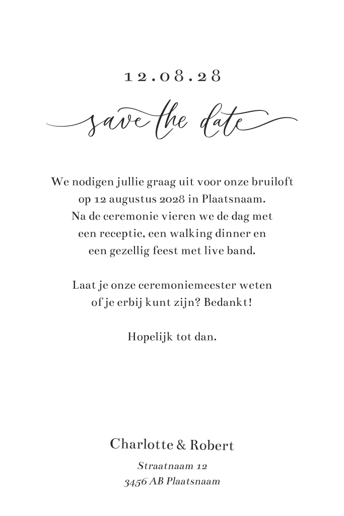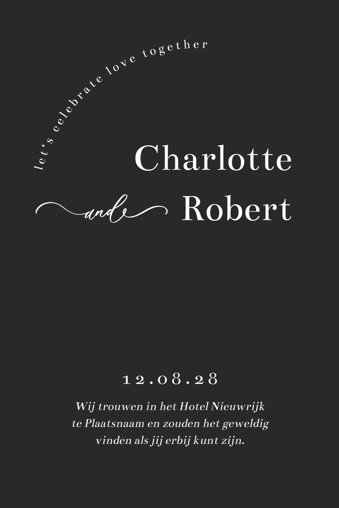 Voeg een vleugje tijdloze klasse toe aan jullie uitnodigingen met onze donkergrijze trouwkaart, voorzien van klassieke typografie. De diepe grijstint vormt een kalme achtergrond, perfect om de verfijnde letters te accentueren. Eenvoudig en klassiek, deze kaart nodigt dierbaren uit voor jullie aankomende trouwdag op een stijlvolle manier. Liever een andere achtergrondkleur? Pas deze kaart zelf aan in onze editor en bestel een proefdruk om deze in het echt te kunnen bewonderen.