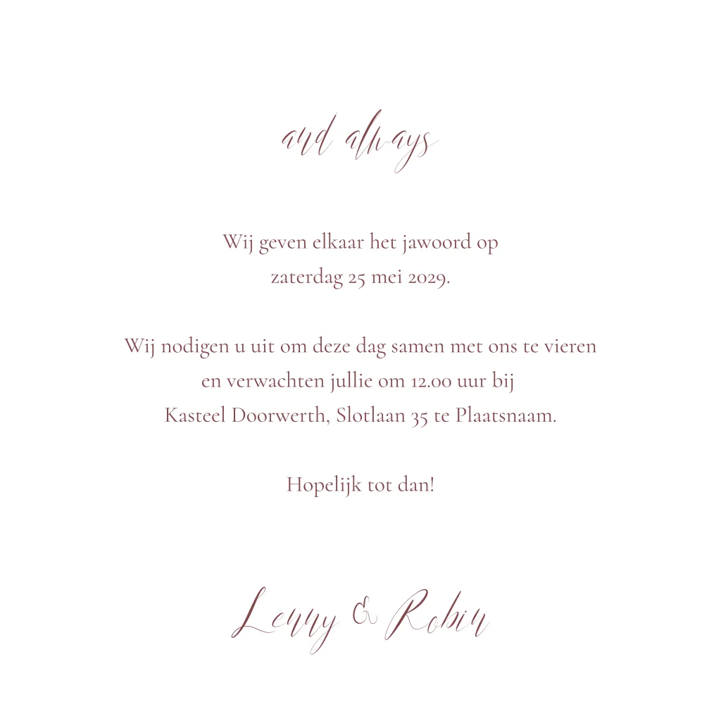 Laat liefde spreken met deze stijlvolle trouwkaart in donkerrood en glimmend roségouden namen. Een tijdloos ontwerp dat straalt in eenvoud. Jullie namen komen in klassieke typografie voorop, met daartussen in sierlijke letters 'yes, we do'. Is donkerrood niet de kleur die aansluit bij jullie trouwdag? Dan kun je dat gemakkelijk aanpassen in onze editor. Klaar met je aanpassingen? Bestel een drukproef en bekijk het resultaat in het echt.