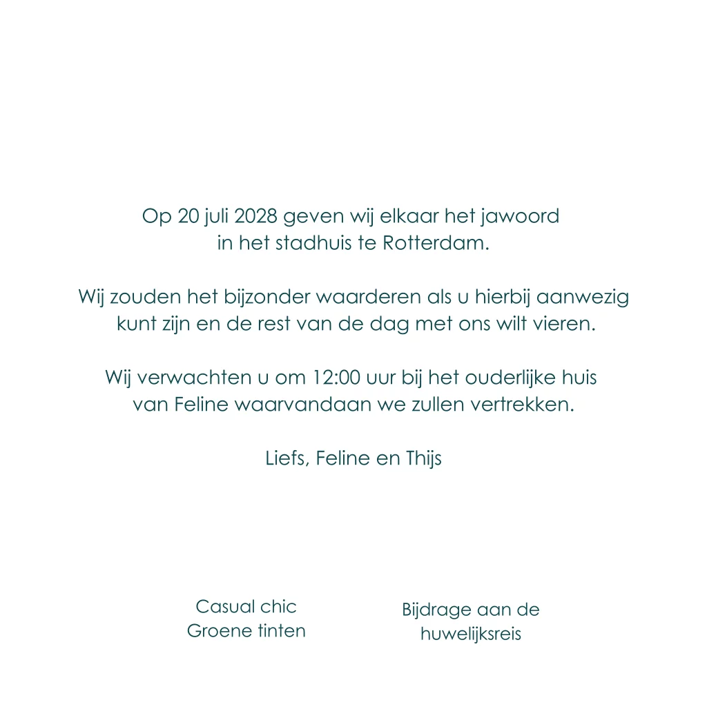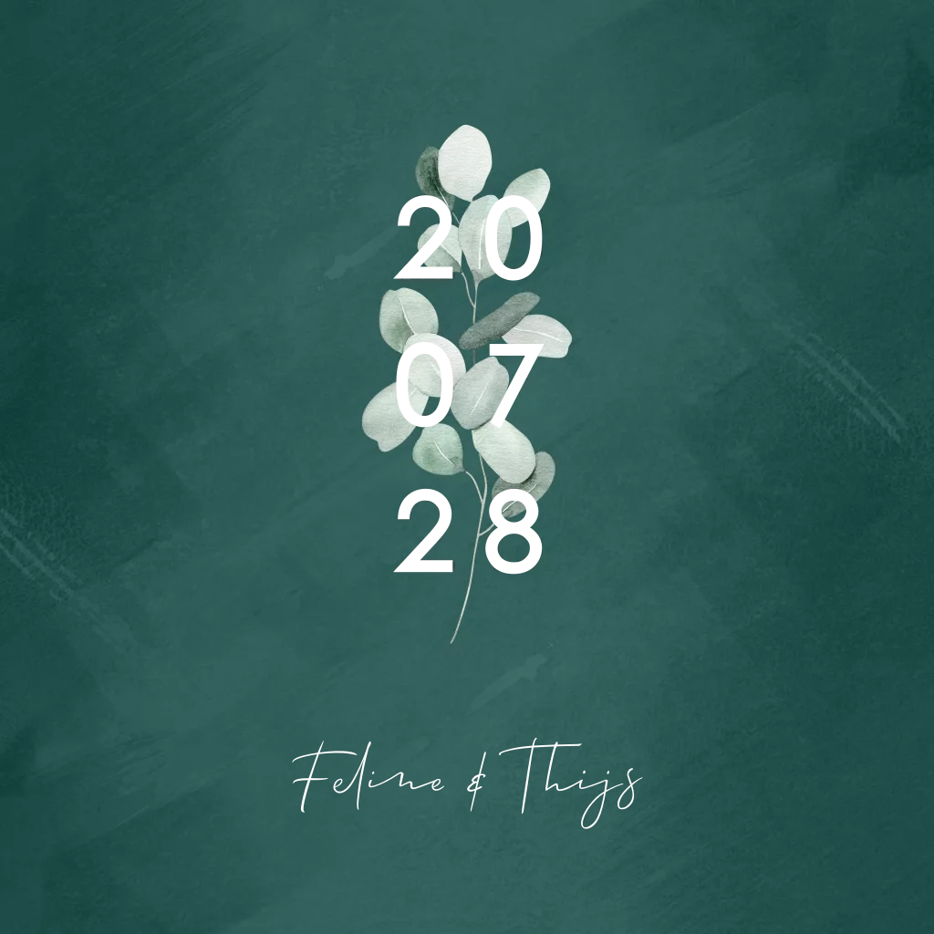 Prachtige trouwkaart met donkergroene achtergrond, geschilderde bladeren en goudfolie typografie. Stijlvol, modern en botanische uitnodiging voor jullie trouwdag. Personaliseer dit ontwerp in onze handige editor en pas eventueel kleuren of lettertypes aan. Klaar met je aanpassingen? Bestel een drukproef en bekijk het resultaat in het echt.