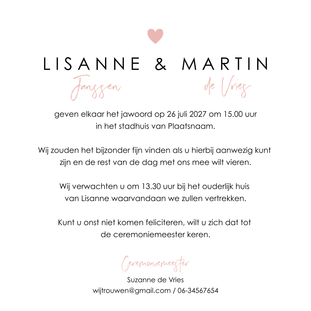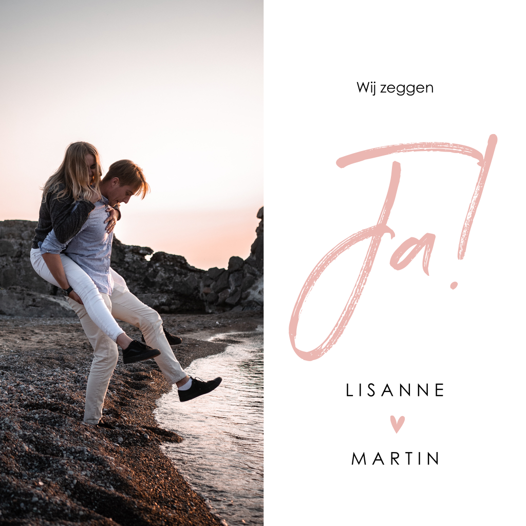 Gaan jullie binnenkort trouwen en ben je op zoek naar een originele trouwkaart met niet teveel poespas? Dan is deze hippe uitnodiging voor je huwelijk misschien wat voor jullie. Je kunt op de ene kant je eigen foto plaatsen en op de andere kant staat in grote letters "JA!". Je kunt alle teksten eenvoudig zelf aanpassen met onze designtool. Klaar? bestel eerst een drukproef van het eindresultaat.