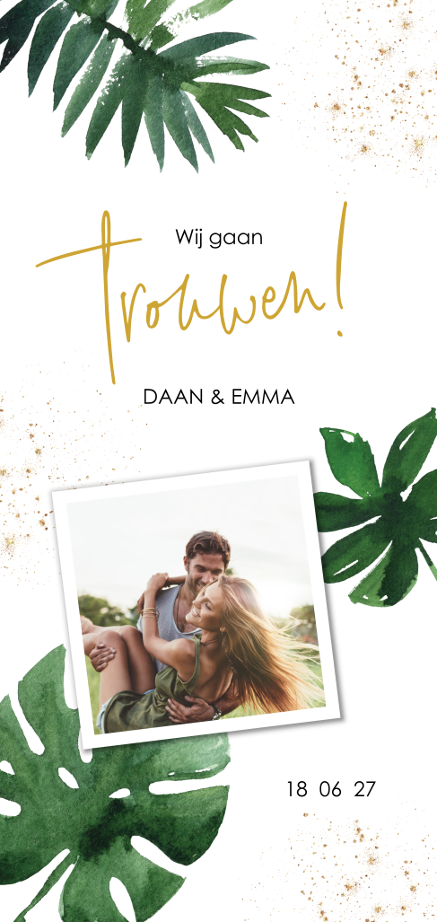 Trouwen jullie in een kas, het bos of in de tuin? Wat dacht je van deze hippe, botanische trouwkaart met ruimte voor een eigen foto en grote tropische bladeren. De uitnodiging is versierd met vrolijke spetters, die de kaart een extra speels effect geven.