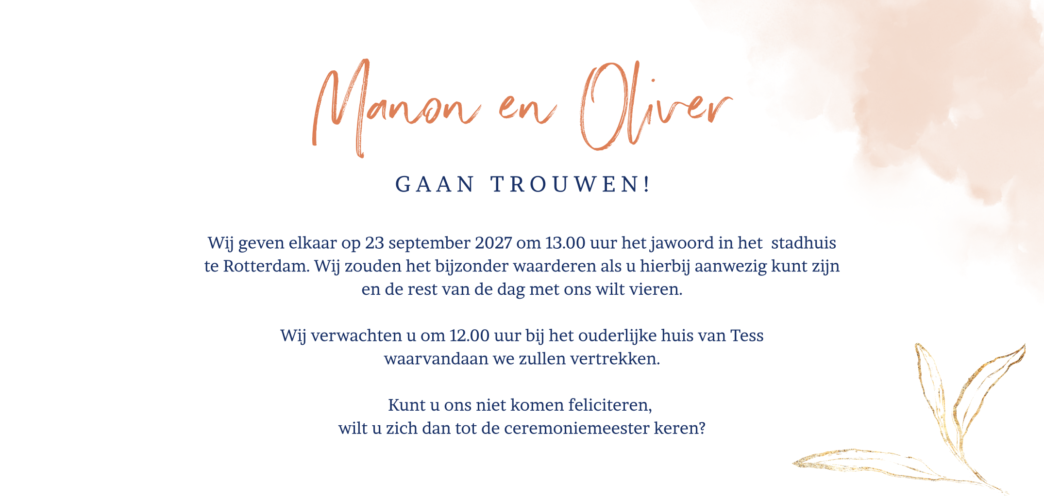 Chique trouwkaart met jullie initialen voorop. Zo wordt jullie trouwkaart extra persoonlijk. Bij de illustraties kun je alle letters van het alfabet terugvinden. De warme kleuren zorgen voor een stijlvolle kaart. Binnenin is veel ruimte voor jullie gegevens.