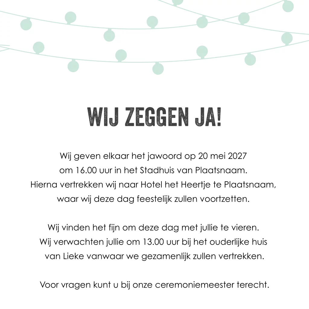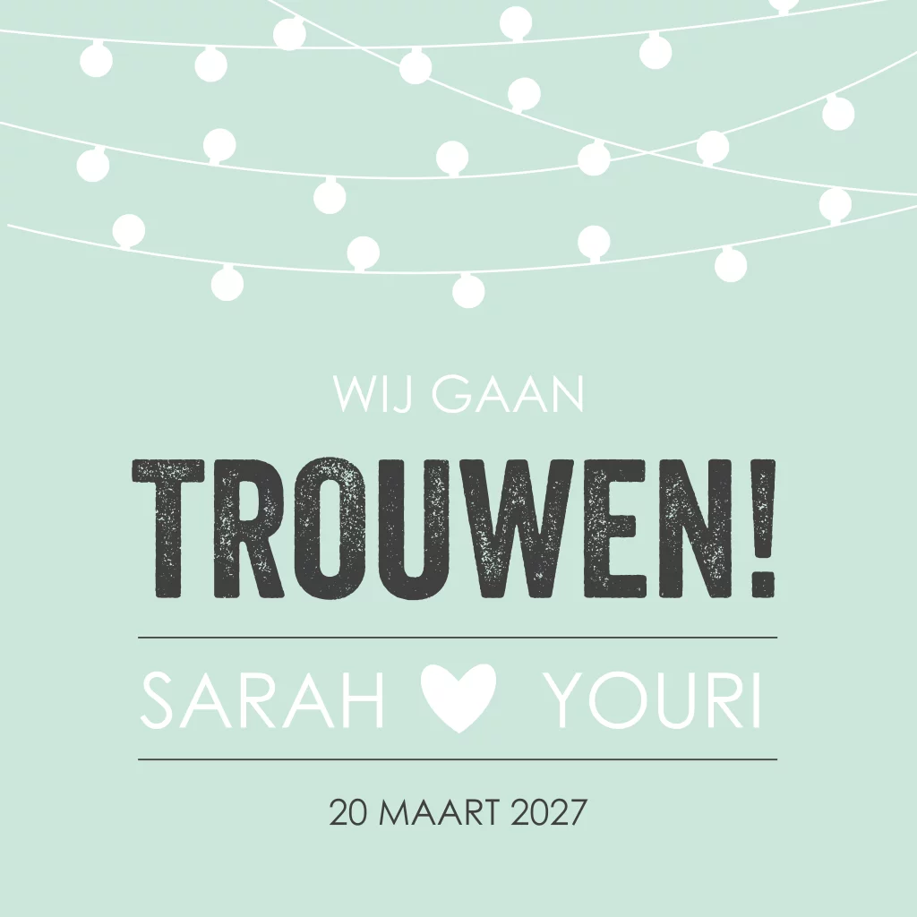 Hippe trouwkaart met lampjes in mintgroen. Hebben jullie een ander kleurthema op jullie trouwdag? Pas eenvoudig de kleur aan in de designtool naar een kleur die wel bij jullie trouwdag past. Op de voorzijde staan slingers met lampjes die aan de binnenzijde weer terugkomen. Pas de kaart naar wens aan en bestel een drukproef.