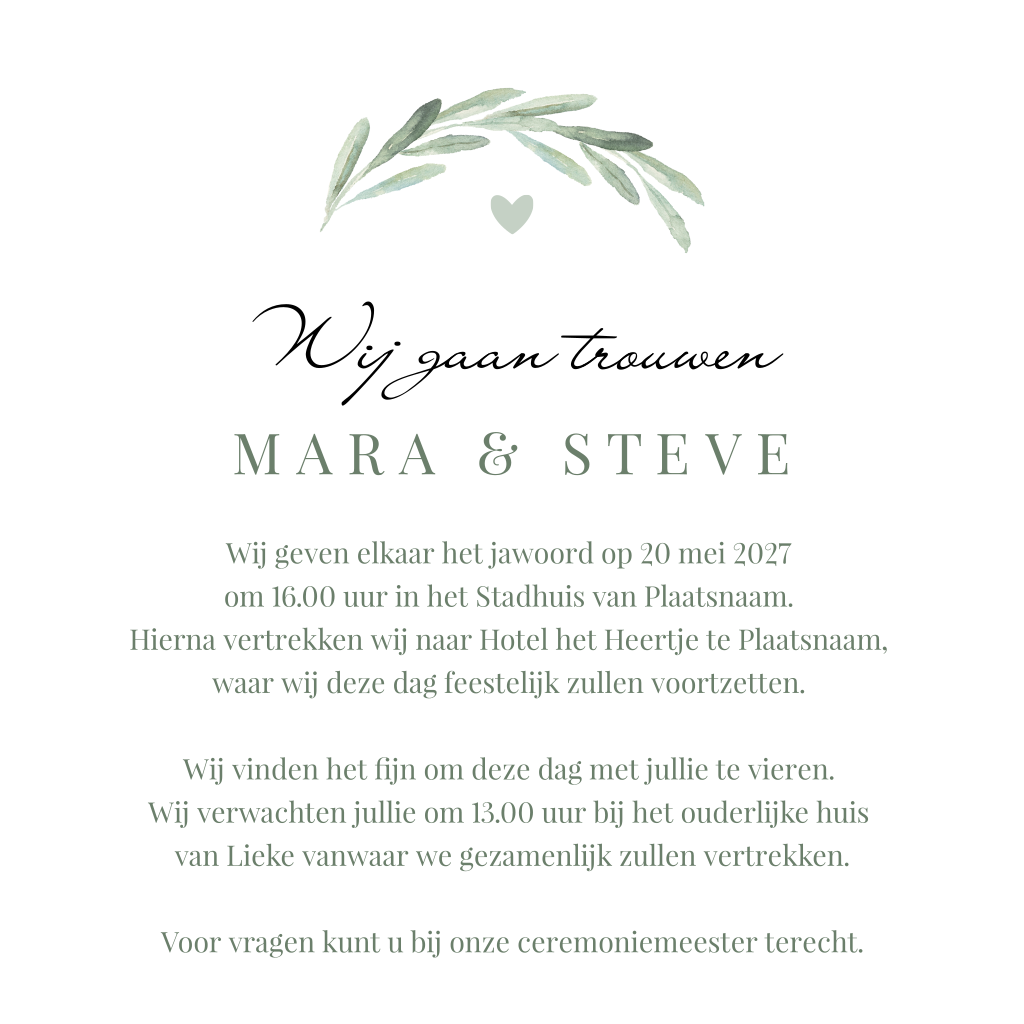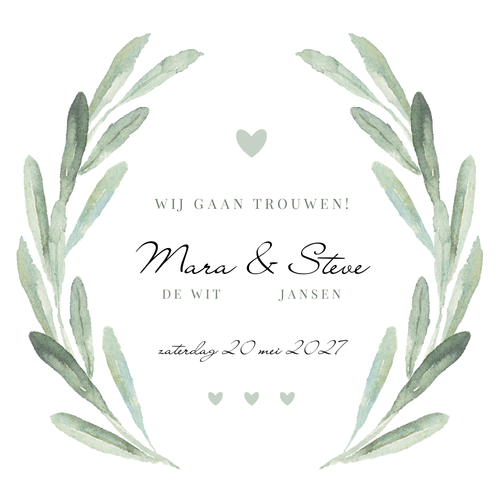 Klassieke vierkant trouwkaart met groene bladeren en hartjes. Voor de mooiste dag van je leven zoek je natuurlijk de mooiste trouwkaart. Dit klassieke ontwerp met bladeren en hartjes is één van onze bestsellers. De kaart is mooi in evenwicht en er is ruimte genoeg om alle informatie kwijt te kunnen over jullie trouwdag.