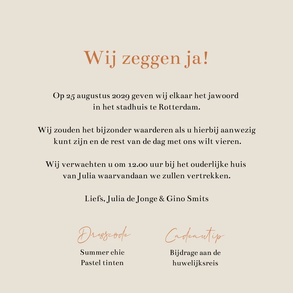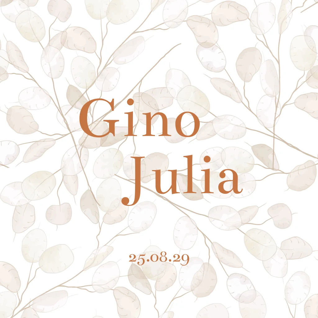 Botanische trouwuitnodiging met achtergrond van beige blaadjes. Een zacht ontwerp met roestbruine typografie. Eenvoudig, maar stijlvol. Plaats aan de binnenzijde jullie dagprogramma en alle info over jullie aankomende trouwdag. Toch liever goudfolie? Pas dit ontwerp eenvoudig aan in onze handige ontwerptool en bestel een proefdruk.