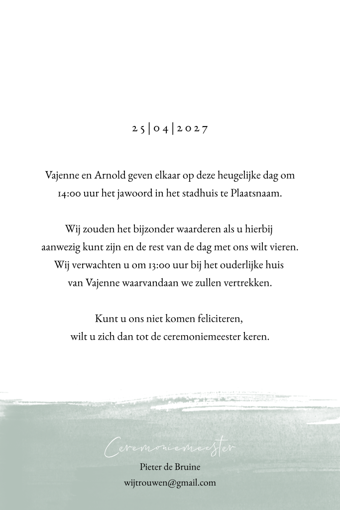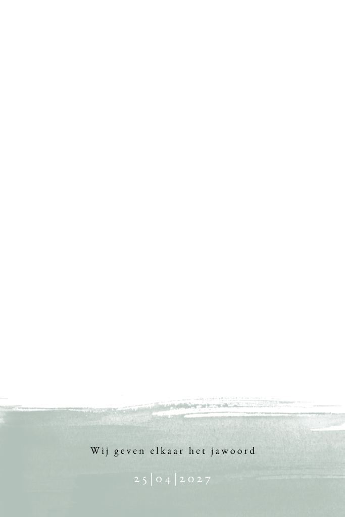 Minimalistische zachtgroene waterverf trouwkaart met goudfolie. Deze trouwkaart heeft een minimalistisch ontwerp, maar valt toch op door de mooie goudfolie typografie en zachtgroene waterverf. Aan de binnenzijde van deze dubbele kaart staat een tijdlijn met getekende icoontjes, deze kun je helemaal aanpassen naar je eigen dagprogramma in onze ontwerptool. Zie je liever een ander lettertype op de kaart? Of toch niet zo'n fan van grijsgroen. Je kunt de waterverf gemakkelijk omkleuren en de lettertypes naar wens aanpassen. Zo maak je deze trouwkaart helemaal naar je eigen zin! Benieuwd naar het eindresultaat? Bestel een proefdruk met jullie eigen namen erop.