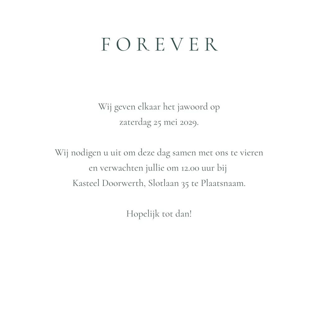 Laat liefde spreken met deze minimalistische trouwkaart in diep donkergroen en subtiel goudaccent. Een tijdloos ontwerp dat straalt in eenvoud. Jullie namen komen in klassieke typografie voorop, met daartussen in glimmend goudfolie 'yes, we do'. Is donkergroen niet de kleur die aansluit bij jullie trouwdag? Dan kun je dat gemakkelijk aanpassen in onze editor. Klaar met je aanpassingen? Bestel een drukproef en bekijk het resultaat in het echt.