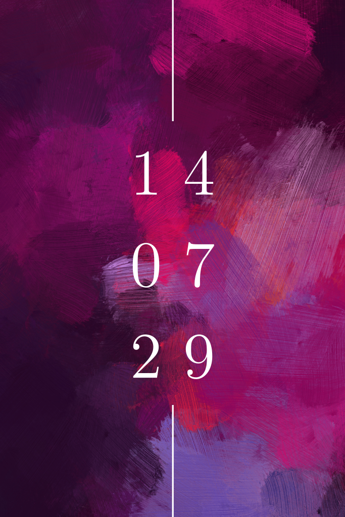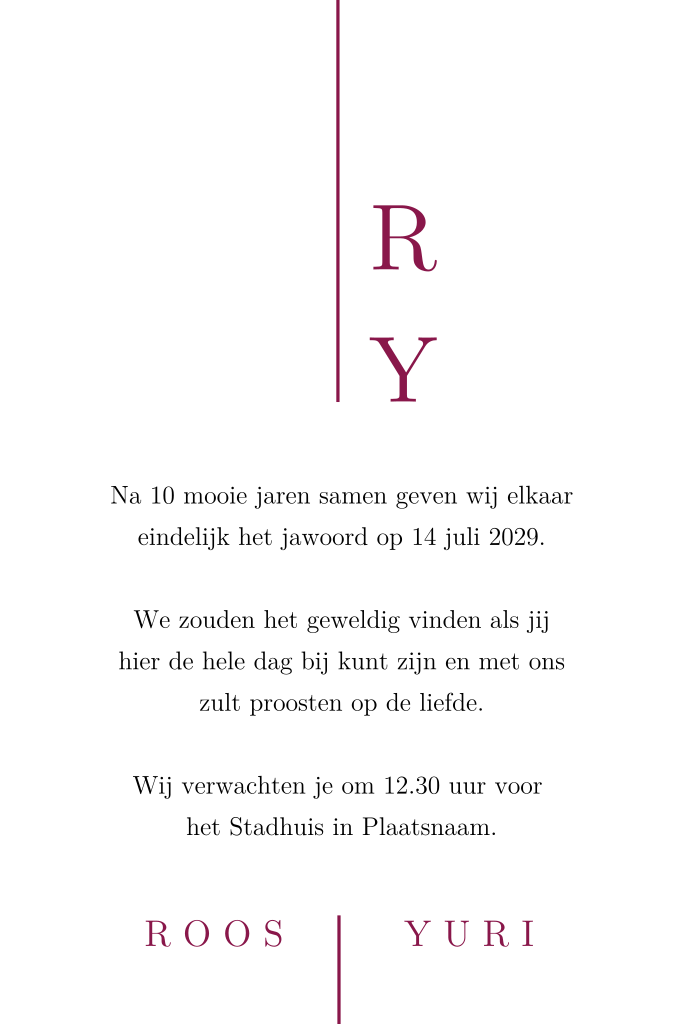 Chique trouwkaart met geverfde achtergrond in dieppaarse en roze tinten. Jullie trouwdatum komt in grote, witte cijfers voorop. De eenvoudige opmaak qua typografie combineert prachtig met de weelderige verfstreken in warme tinten. Aan de binnenzijde is ruimte voor een dagprogramma en tekst over jullie trouwdag. Pas deze unieke trouwuitnodiging zelf aan in onze editor.