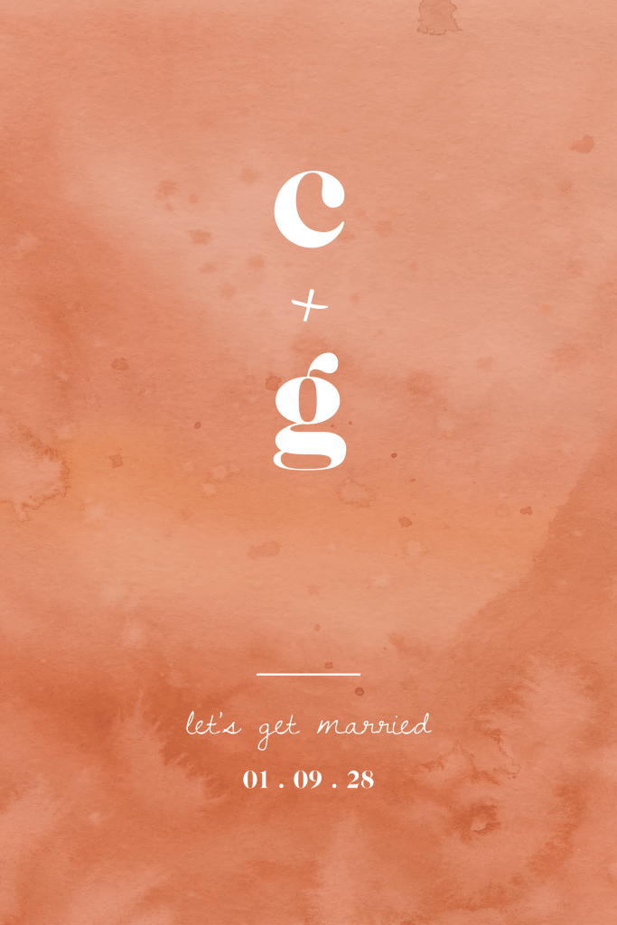 Minimalistisch trouwkaartje in roestbruine kleur en waterverf achtergrond. Jullie initialen komen in opvallende, witte letters voorop. Op de achterkant van dit enkele kaartje is ruimte voor informatie over jullie trouwdag. De afgeronde hoeken geven dit kaartje net dat beetje extra. Pas dit ontwerp zelf aan in onze handige editor.