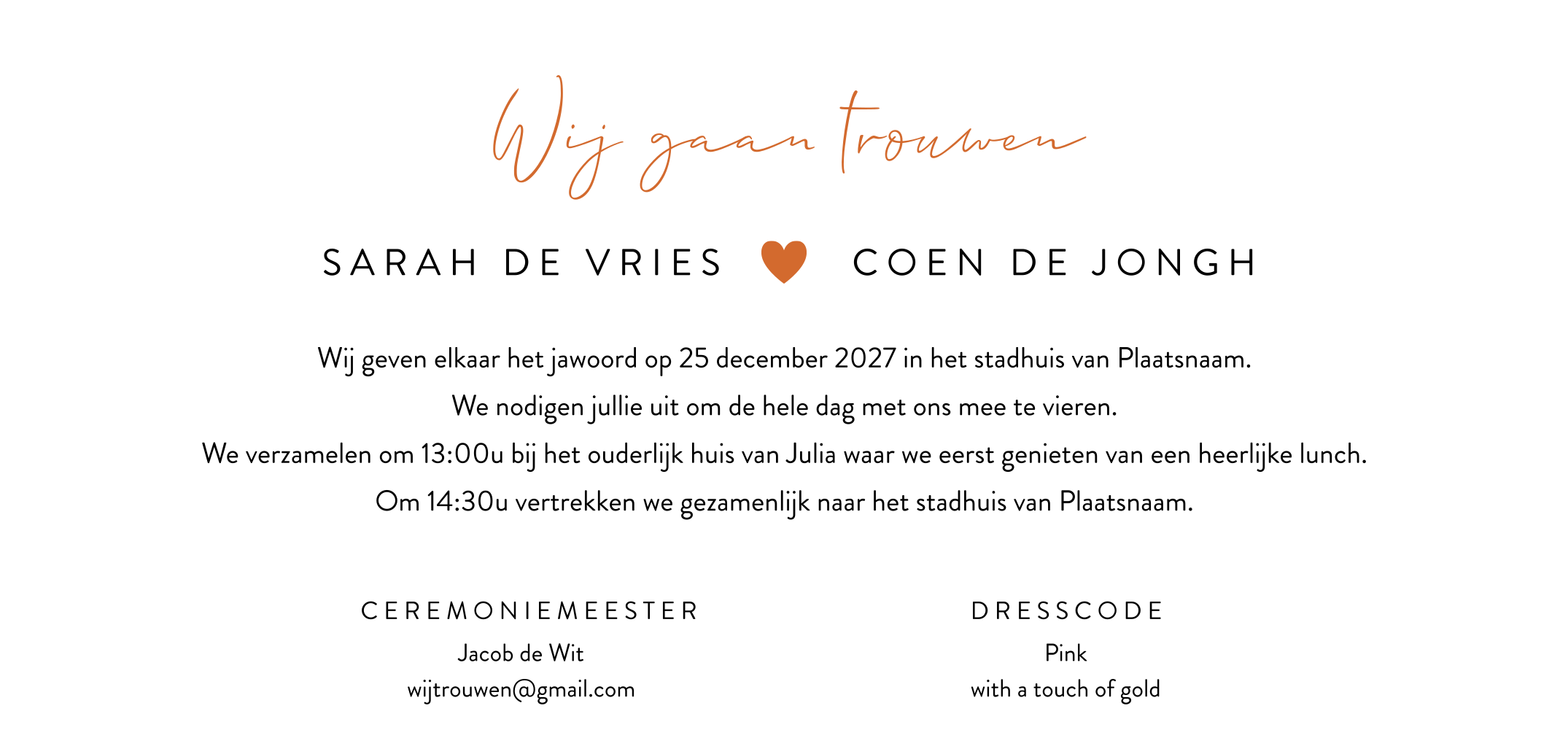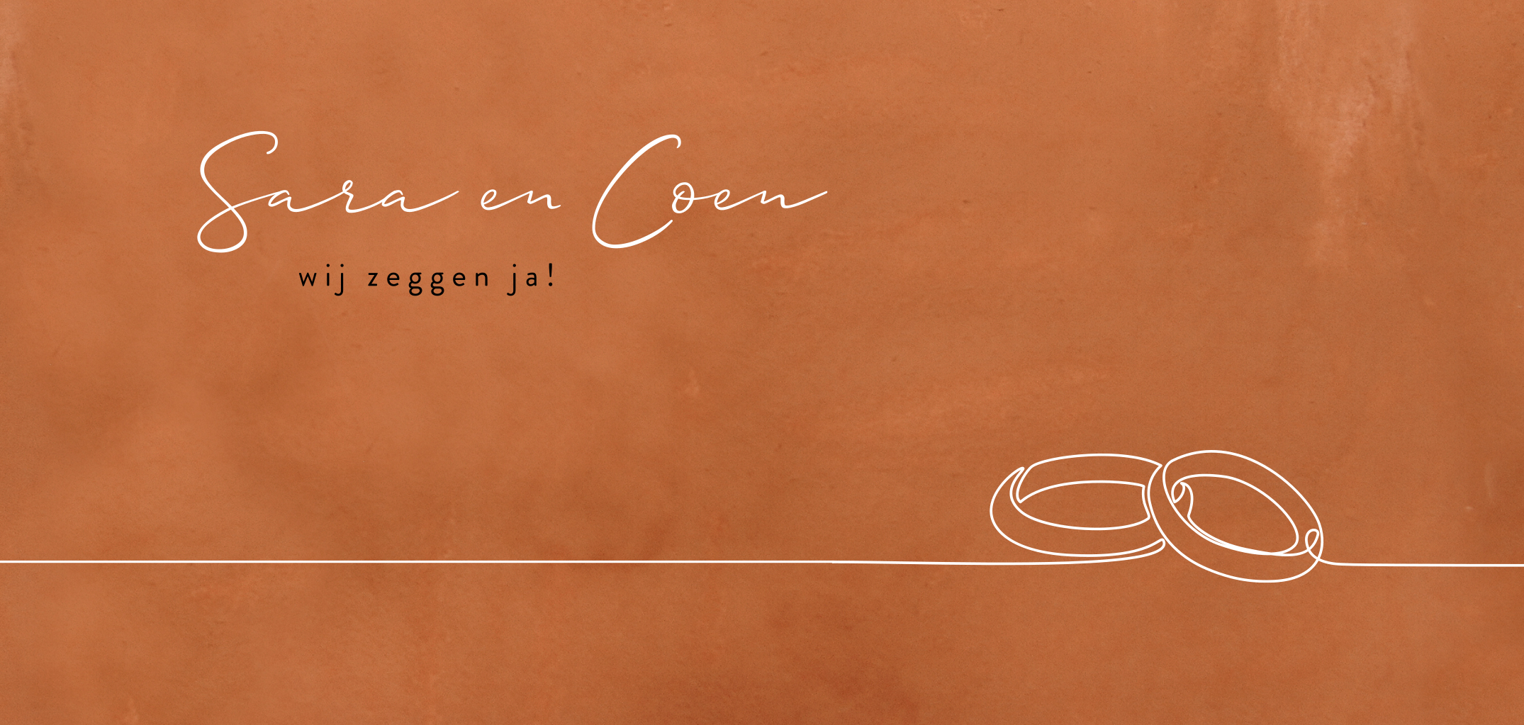 Langwerpige trouwkaart met roestrode waterverf achtergrond en lijntekening van trouwringen. Ben je op zoek naar een eenvoudige, maar stijlvolle trouwkaart? Ga dan voor dit liggende ontwerp met een lijntekening van trouwringen en een hippe roestrode achtergrond. De speelse typografie maakt het kaartje helemaal af. Aan de binnenkant van de kaart komt de trendy kleur terug en kun je alle informatie voor je gasten plaatsen. Bestel een proefdruk om te zien hoe de kaart er in het echt uit komt te zien.
