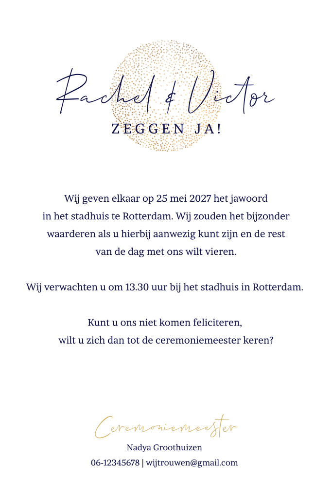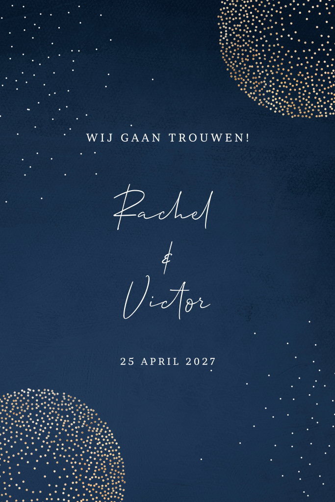 Donkerblauwe trouwkaart met gouden cirkel van sterren