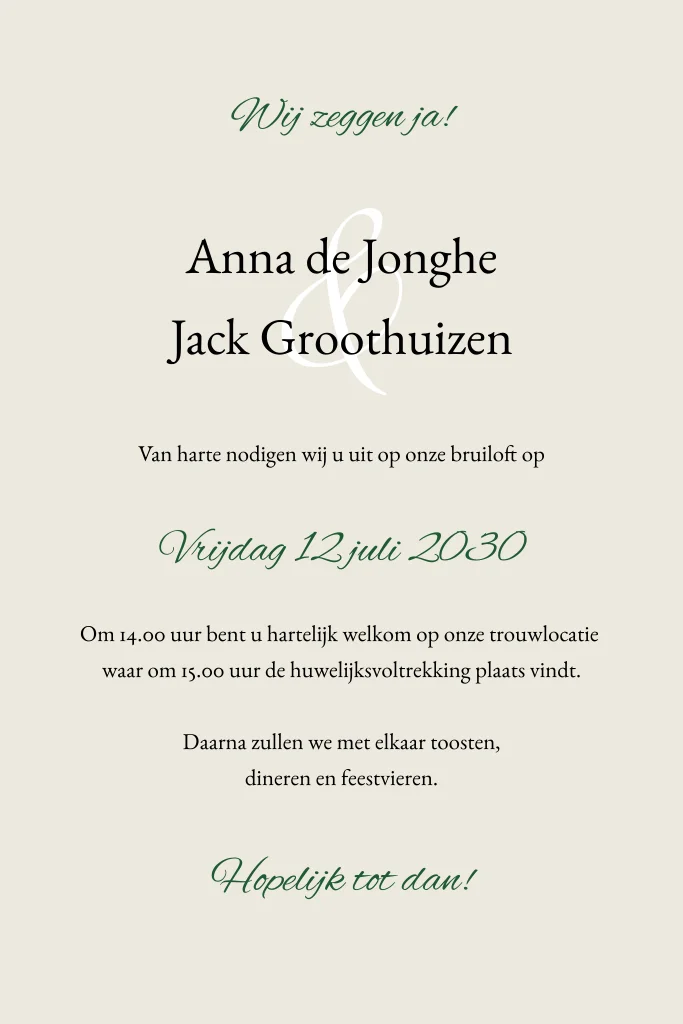 Deze unieke trouwkaart straalt pure Hollandse charme uit. Het ontwerp toont twee schilderachtige molens aan het water, omlijst door groen landschap en vliegende vogels, prachtig weergegeven in aquarel. Bovenin is ruimte voor jullie namen en de trouwdatum. Perfect voor stellen die houden van natuur, traditie of een bruiloft in landelijke sfeer. Een sfeervolle en originele manier om jullie grote dag aan te kondigen.
