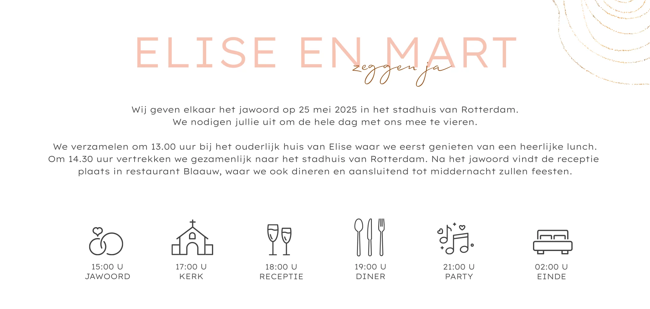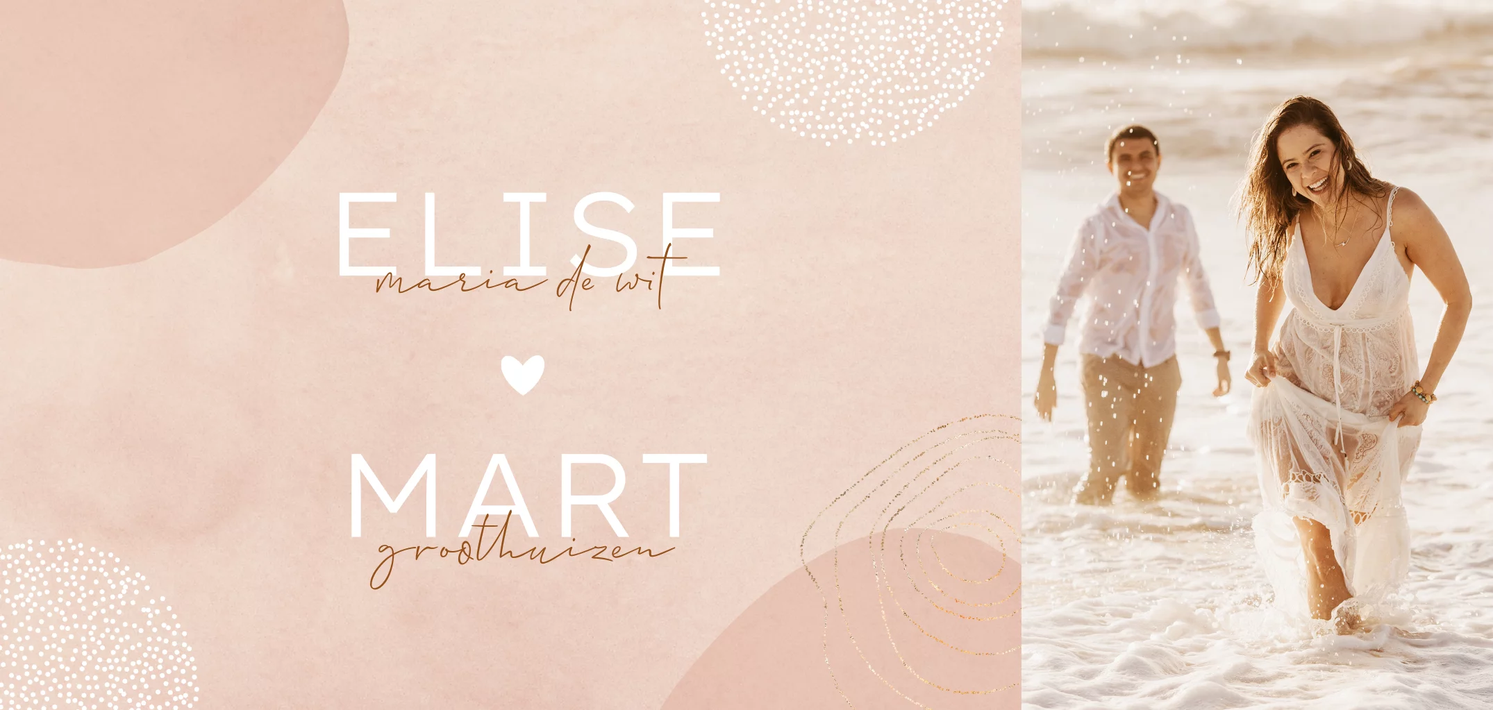 Abstracte trouwkaart met typografie, witte stipjes en roze waterverf. Deze dromerige trouwkaart is de juiste combinatie tussen modern en klassiek. Het chique lettertype met de roze waterverf en witte stippen geven de kaart een hedendaagse uitstraling. Rechts is er ruimte voor een foto van jullie samen. In de kaart kun je het dagprogramma plaatsen. Pas de kaart naar wens aan en bestel een drukproef om de kaart in het echt te beoordelen.