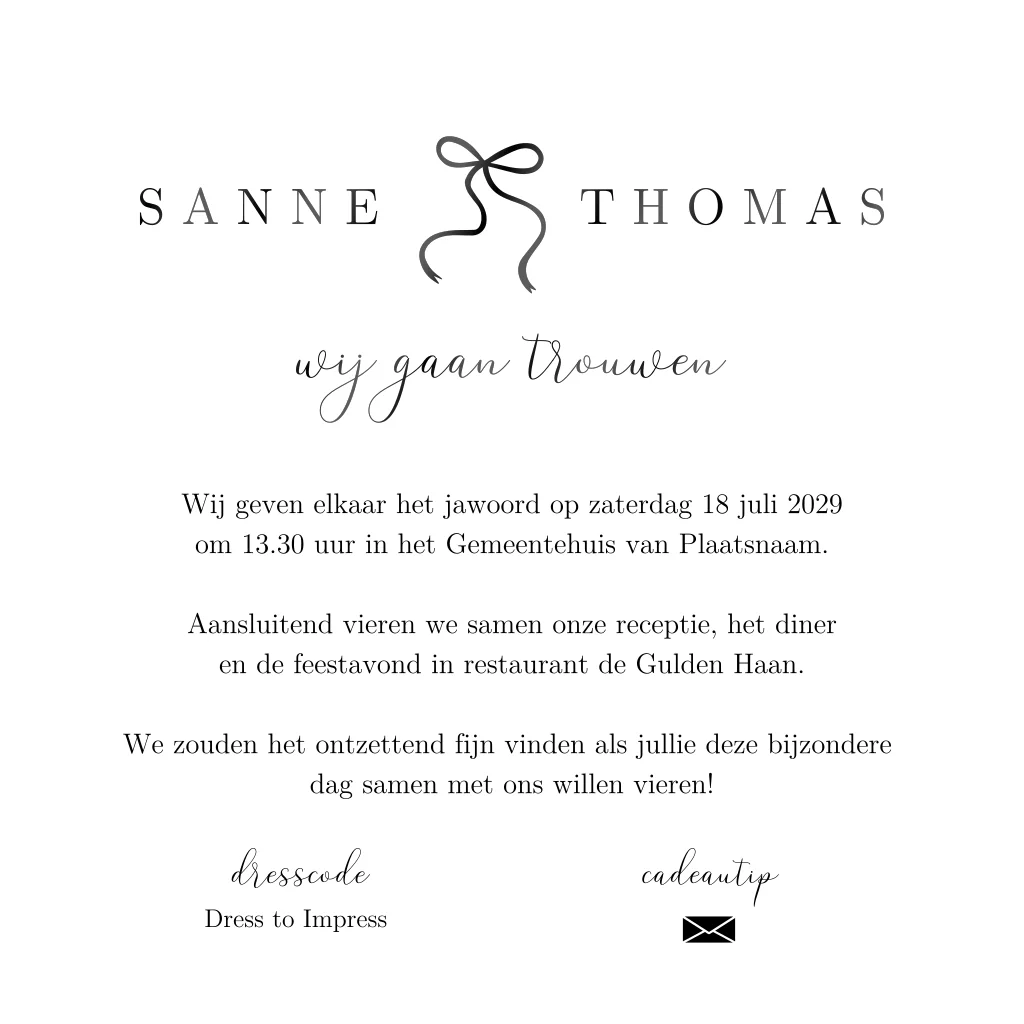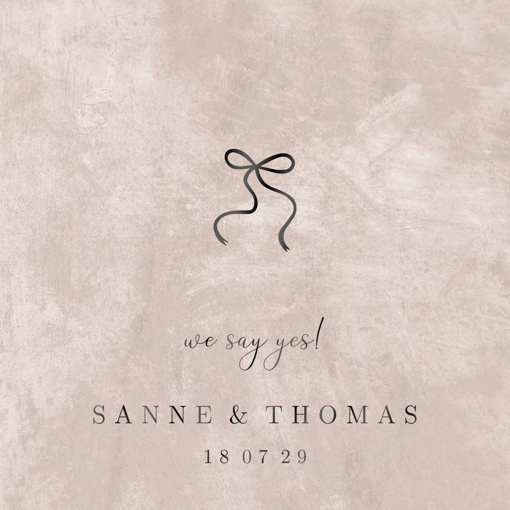 Zachtroze trouwkaart met hoogglans zwart strikje. De achtergrond heeft een zachtroze pastelkleur met een softe textuur. De subtiele illustratie van het strikje maakt deze trouwuitnodiging helemaal af. Aan de binnenzijde kun je alle informatie kwijt over jullie trouwdag. Pas de kaart zelf aan in onze editor.