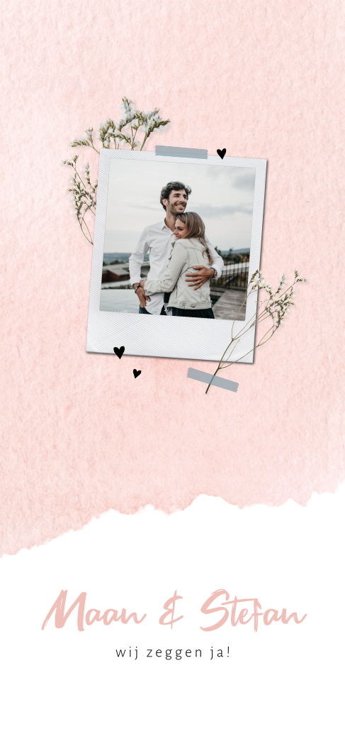 Een dromerig en lief ontwerp om al jullie gasten uit te nodigen voor jullie grote dag. Op de voorzijde staat een polaroid kader waarin je een eigen foto kunt plaatsen. De kaart wordt versierd met droogbloemen, kleine hartjes en mooie, roze waterverf. Pas deze trouwkaart aan in onze ontwerptool en bestel een proefdruk.