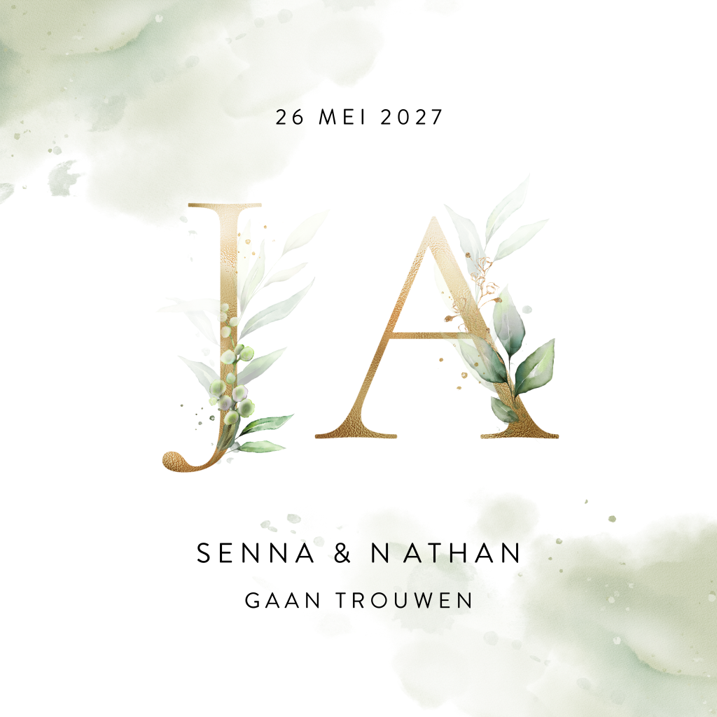 Stijlvolle trouwkaart met lichtgroene waterverf en 'JA' in goudkleurige letters en spetters. De kaart is versierd met subtiele bladeren. Voorop de kaart staan de letters 'JA'. In de kaart is ruimte voor de gegevens van de ceremoniemeester en de dresscode. Pas de kaart naar wens aan in de ontwerptool en bestel een drukproef om het gedrukte resultaat te bekijken.