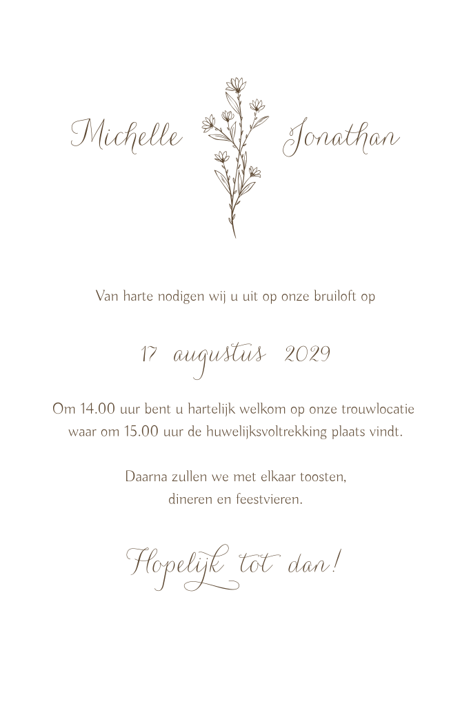 Een stijlvolle trouwuitnodiging in zachte grijze tint met donkerbruine typografie. In het ovale fotokader kun je een eigen foto plaatsen. De getekende bloemen maken dit ontwerp helemaal af. Pas deze trouwkaart zelf aan in onze ontwerptool.