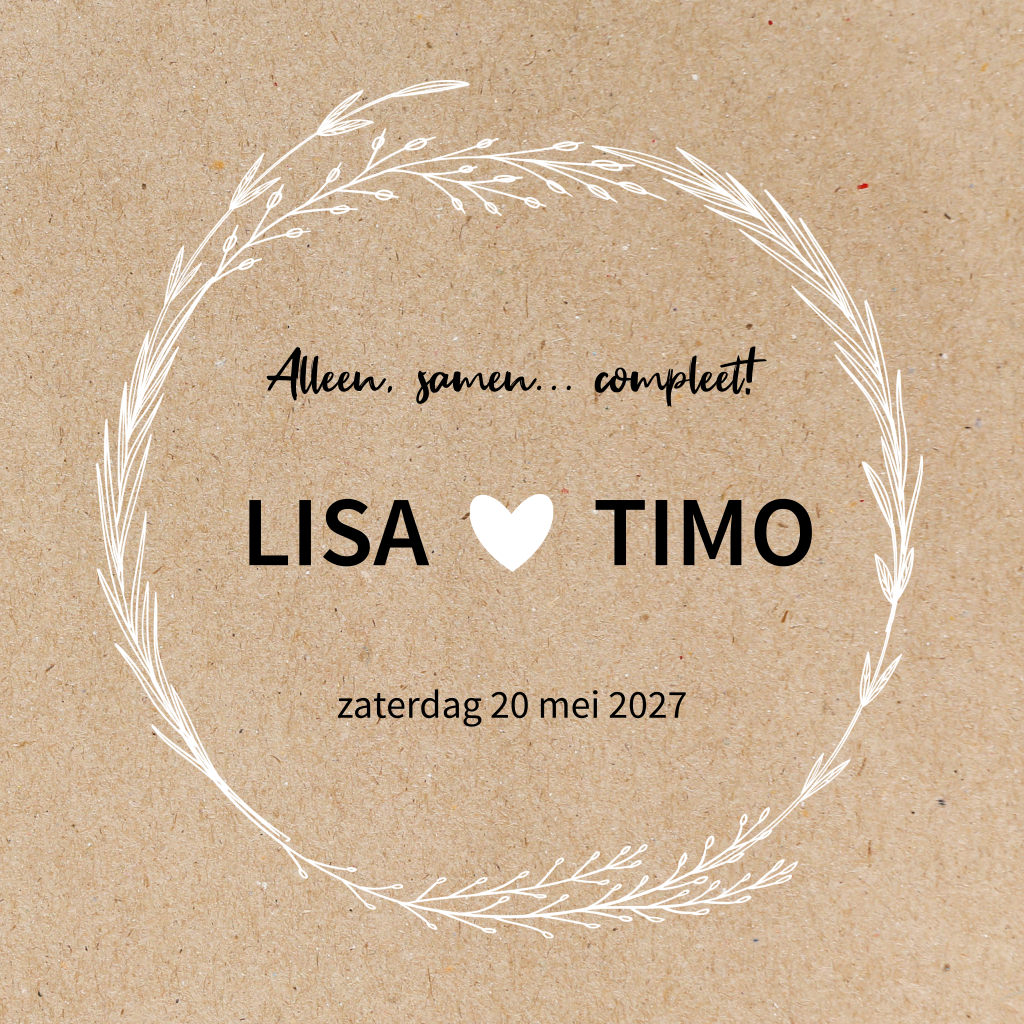 Stoere trouwkaart op een kraft achtergrond. Let op! Deze kraft achtergrond is erop gedrukt en is dus geen echt kraftpapier. Op het kraft staat in wit een krans van takjes en bladeren met daarin in stoere typografie jullie namen en de trouwdatum. Pas zelf de kaart aan met de designtool en bestel een drukproef. Zo kun je de uitnodiging eerst in het echt zien. Tip: kies voor structuur papier dan komt het kraft mooi uit en lijkt het net echt.