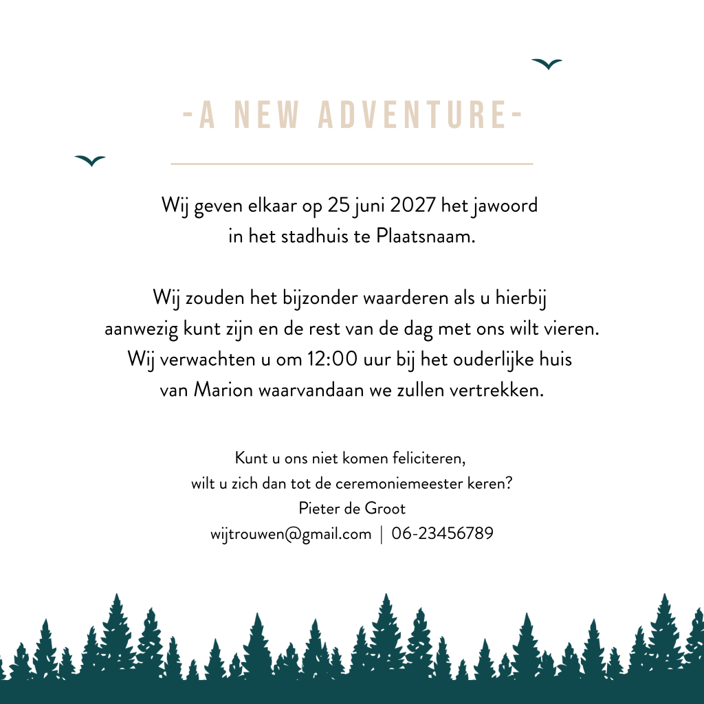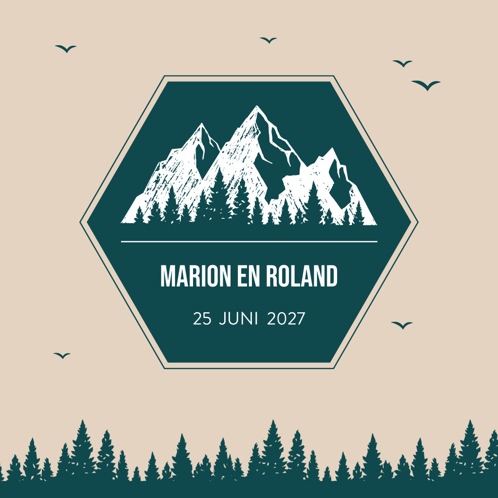Stoere trouwkaart met beige achtergrond, donkergroene zeshoek en berglandschap. Zijn jullie echte avonturiers en op zoek naar een toepasselijke trouwkaart? Dan is deze originele, vierkante trouwkaart met een perfecte match. Het is in Scandinavische stijl met bomen, vogels en bergen. Op de voorkant staat een zeshoek waar jullie namen in staan. Hebben jullie een bepaald kleurthema voor jullie trouwdag? Pas de kaart dan eenvoudig aan in deze kleuren. Alle elementen staan nl los op de kaart.