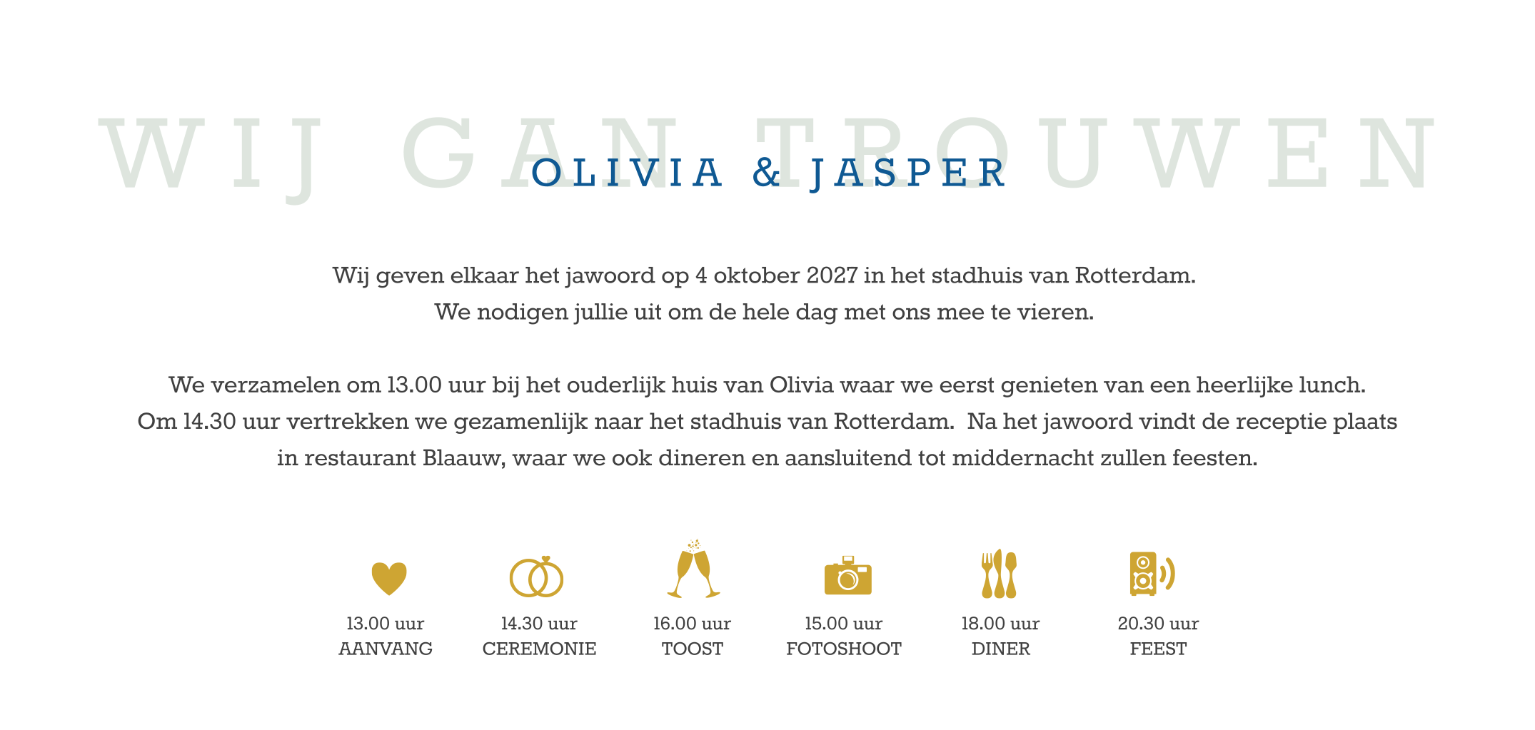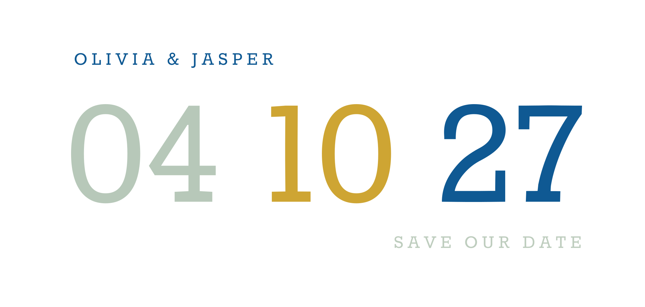 De trouwdatum is dé belangrijkste dag om nooit meer te vergeten. Op deze trouwkaart staat jullie trouwdatum groot op de voorzijde in de trendy kleuren blauw, geel en groen. Deze kleuren kun je uiteraard naar eigen inzicht aanpassen. Ben je op zoek naar een trouwkaart waarop je de trouwdatum wilt laten schitteren? Dan is dit kaartje perfect voor jullie. Aan de binnenkant is ruimte voor een foto, het programma en alle overige informatie.