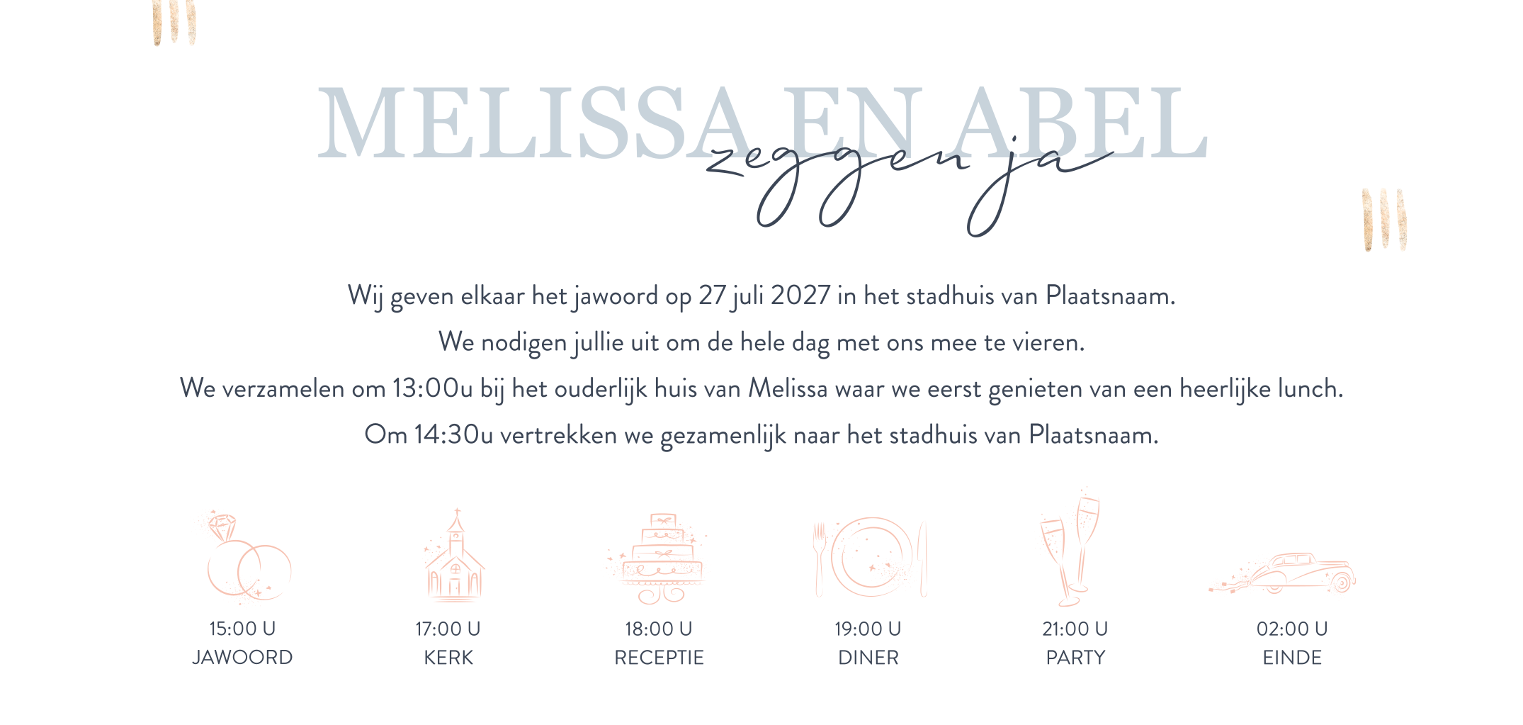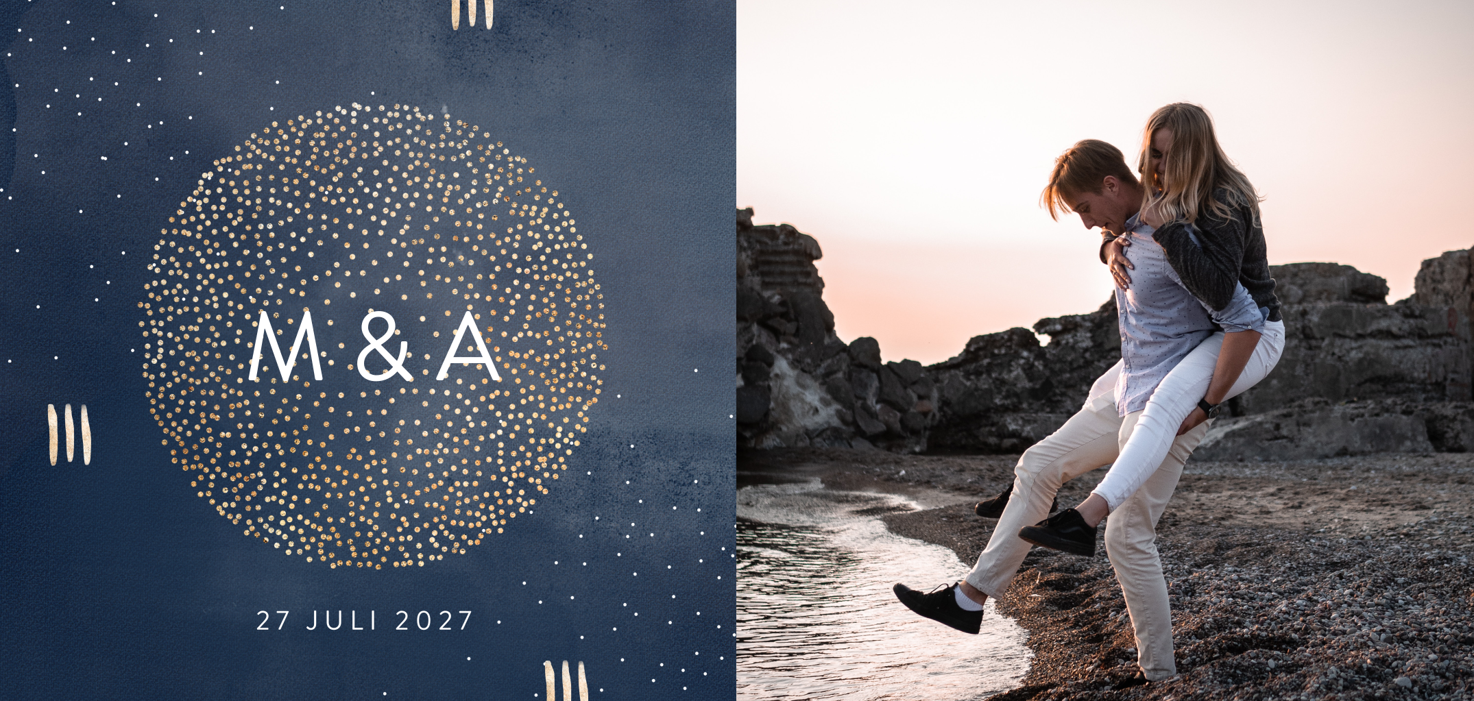 Zijn jullie ware romantici? Dan is deze romantische trouwkaart met gouden cirkel van sterren perfect. Met een sierlijk lettertype staat er 'written in the stars' voorop. Pas de lettertypes en de kleuren naar wens aan om het kaartje te personaliseren. Bestel vervolgens een drukproef om het ontwerp in het echt te bekijken.
