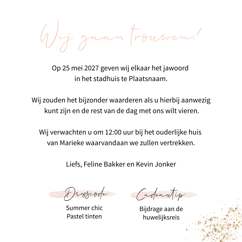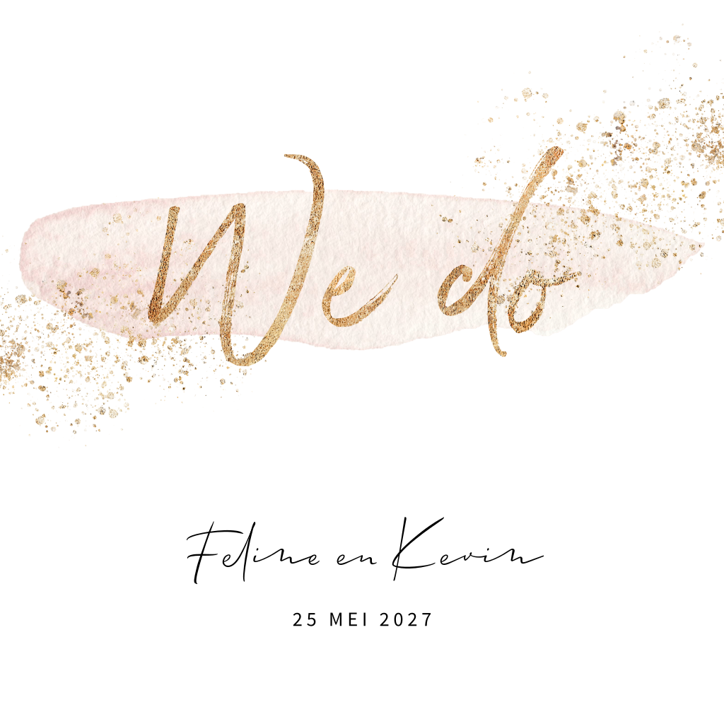 Stijlvolle trouwkaart met blush waterverf en goudkleurige spetters. Witte trouwkaart op vierkant formaat met elegante uitstraling en moderne typografie. De kaart heeft een grote roze waterverf vlek op de voorzijde en is versierd met witgouden spetters. Met mooie gouden letters staat 'we do' bovenaan de kaart. Aan de binnenzijde is ruimte voor het dagprogramma en een persoonlijk bericht. Benieuwd hoe de kaart er in het echt uitziet? Bestel een proefdruk en bekijk het gedrukte resultaat.