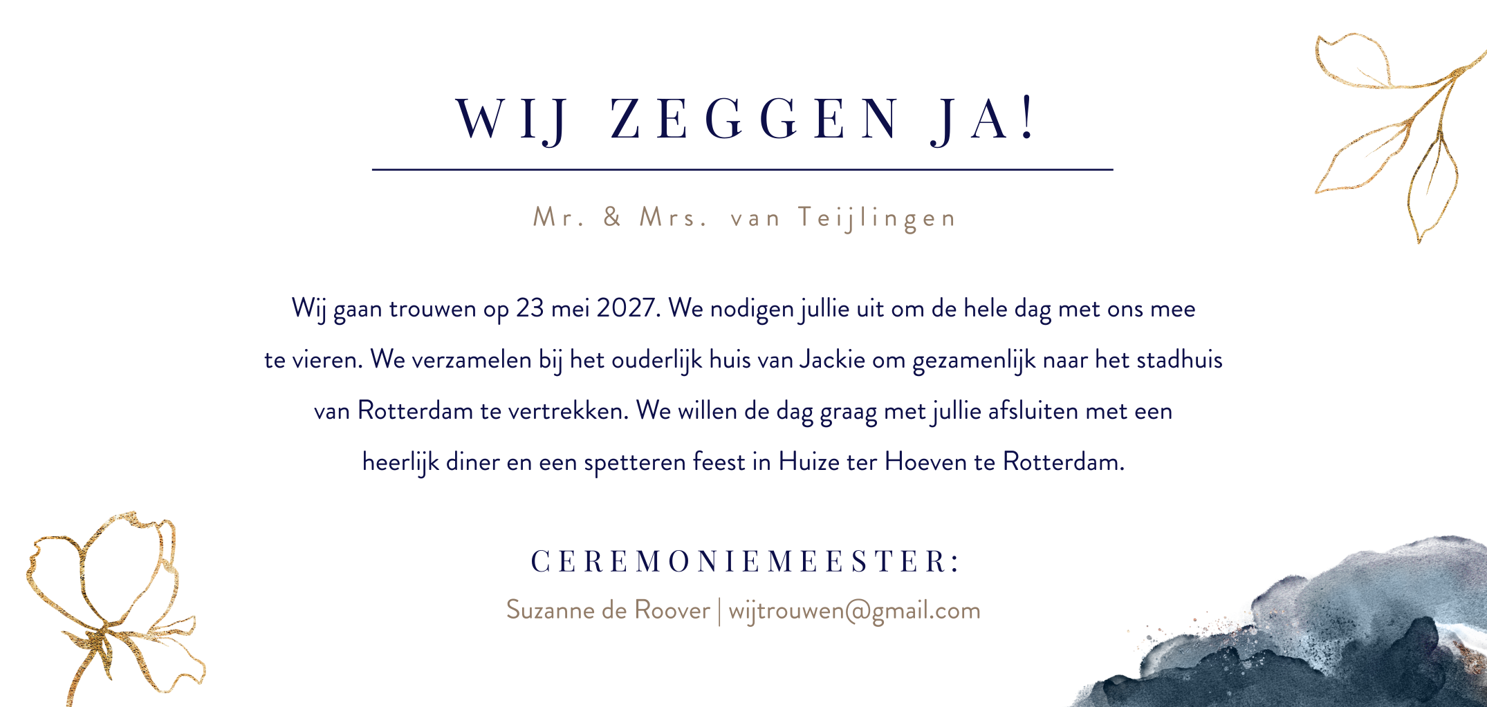 Mooie trouwkaart met goudkleurige bloemen en blauwe waterverf. Mooie, langwerpige trouwkaart met dromerige waterverf in de kleuren goud en donkerblauw. De kaart is versierd met goudkleurige bloemen en bladeren. Jullie namen staan met chique typografie op de voorzijde. In de kaart staat een tijdlijn met het dagprogramma. Deze kun je aanpassen voor de avond- en daggasten.