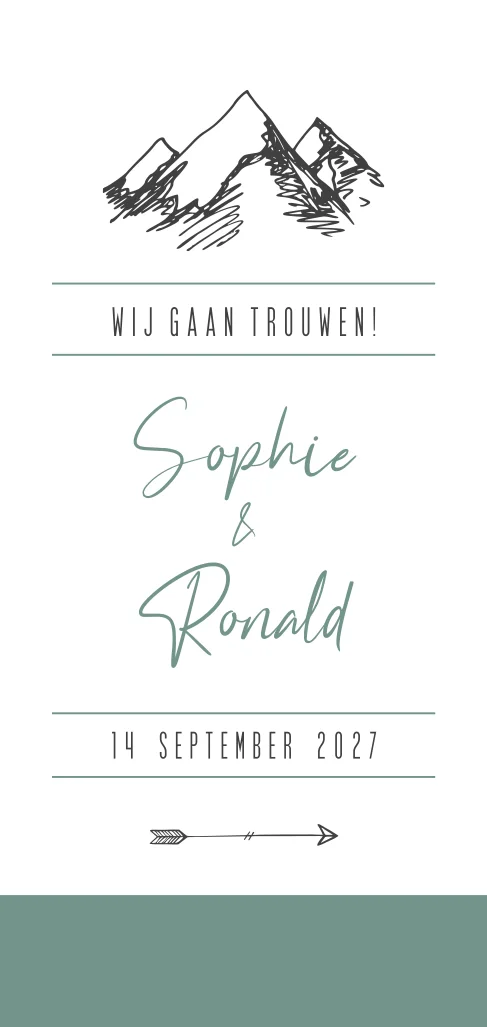 Rustige trouwkaart met getekende bergen. Deze trouwkaart is perfect voor de echte avonturiers. De tekening van de bergen maakt de kaart erg stoer, maar door de typografie is het toch ook weer een sierlijk ontwerp. Achterop kunnen jullie alle informatie over de grote dag kwijt. Tip: dit kaartje komt extra mooi uit op structuurpapier!