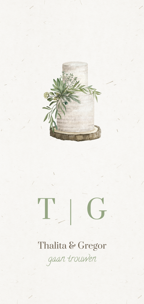 Eenvoudige, maar mooie trouwkaart met waterverf trouwtaart en groene intialen. Op de achtergrond wordt een subtiel papiertextuurtje gedrukt, dit geeft een rustieke uitstraling aan dit kaartje. Jullie initialen komen in een klassiek lettertype voorop. Op de achterzijde is ruimte voor informatie over jullie trouwdag. Pas dit ontwerp zelf aan in onze handige editor.