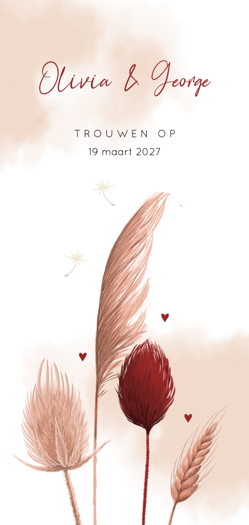 Op zoek naar een trendy trouwkaart met een dromerige uitstraling? Kies dan voor dit langwerpige ontwerp met zachtroze waterverf. Voorop zie je mooie illustraties van droogbloemen en pampasgras. Het stijlvolle lettertype maakt het ontwerp helemaal af. Vind je de roze waterverf iets te veel van het goede? Je kunt het ontwerp naar wens aanpassen in de designtool. Zo kun je de waterverf een andere kleur geven of zelfs helemaal verwijderen.