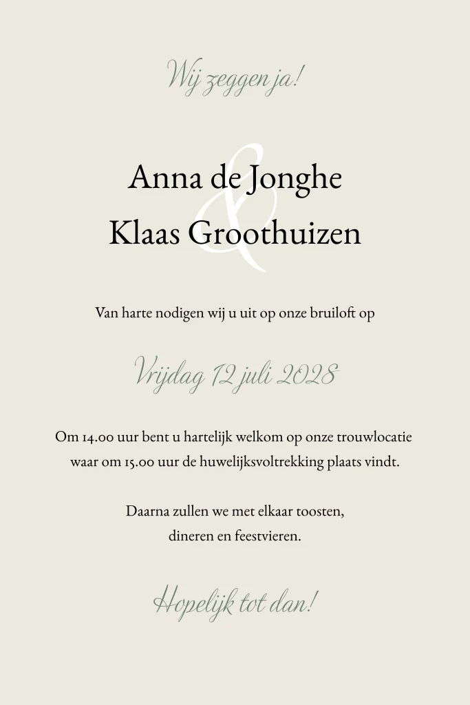 Unieke trouwkaart voor paardenliefhebbers. Op deze kaart staan de namen van het bruidspaar in het midden, omringd door een prachtige aquarel van paarden die vrij door de natuur galopperen. De combinatie van het groene landschap, de vogels in de lucht en de mooie typografie geeft de kaart een landelijke uitstraling. Perfect voor stellen die hun liefde voor elkaar én hun passie voor paarden, buitenleven of manege willen laten terugkomen in hun huwelijksaankondiging.
