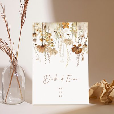 Gaan jullie dit binnenkort trouwen? Deze romantische trouwkaart in neutrale tinten is een prachtige en stijlvolle uitnodiging voor jullie dag. De waterverf veldbloemen in neutrale tinten zoals beige, roest en bruintinten past ook mooi bij een nazomer of herfstbruiloft. Pas de trouwkaart aan en bestel een drukproef.