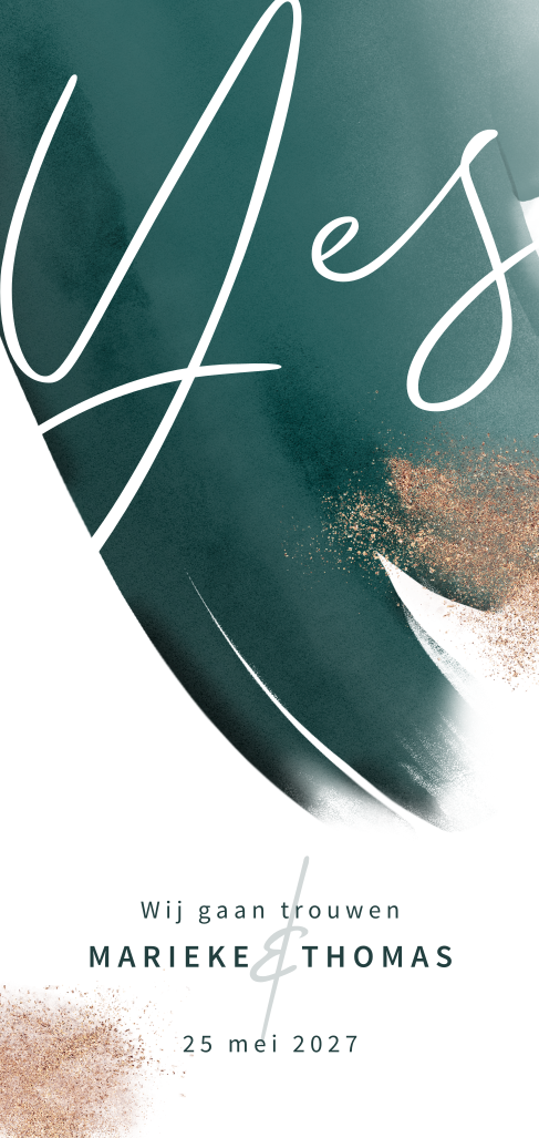Langwerpige trouwkaart met zeegroene waterverf en rosé glitters. Stijlvol en spetters zijn de trend van het moment. Deze populaire combinatie vind je terug op deze mooie trouwkaart. Uit onze databank met beelden kun je nog mooie afbeeldingen toevoegen. Zo maak je het kaartje nog persoonlijker.