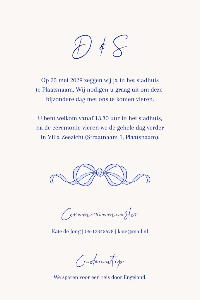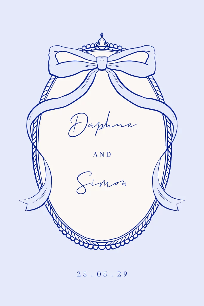 Heeft jullie bruiloft een klassiek thema of gaan jullie voor een trouwerij geïnspireerd op het populaire Bridgerton? Dan past deze prachtige zachtblauwe uitnodiging perfect bij jullie dag. De getekende barok lijst met grote strik omlijst jullie namen op de voorzijde. Aan de binnenzijde staan twee silhouet kopjes van een man en vrouw, helemaal in Victoriaanse stijl. Pas de kleuren eventueel zelf aan in onze editor en geef je eigen draai aan deze romantische trouwkaart.