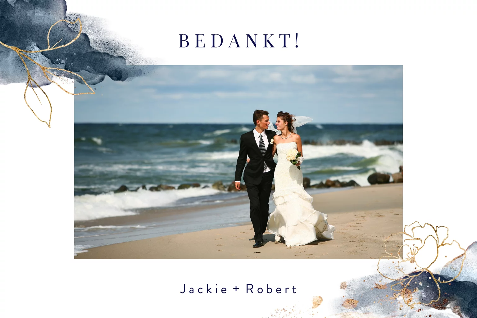 Mooie bedankkaart om alle gasten te bedanken voor de cadeaus en hun aanwezigheid. De kaart heeft vlekken van donkerblauwe waterverf, gouden spetters en bloemen. Plaats een mooie foto van de dag zelf op de voorzijde als herinnering aan jullie fantastische trouwdag. Op de achterzijde is er ruimte voor een tekst.