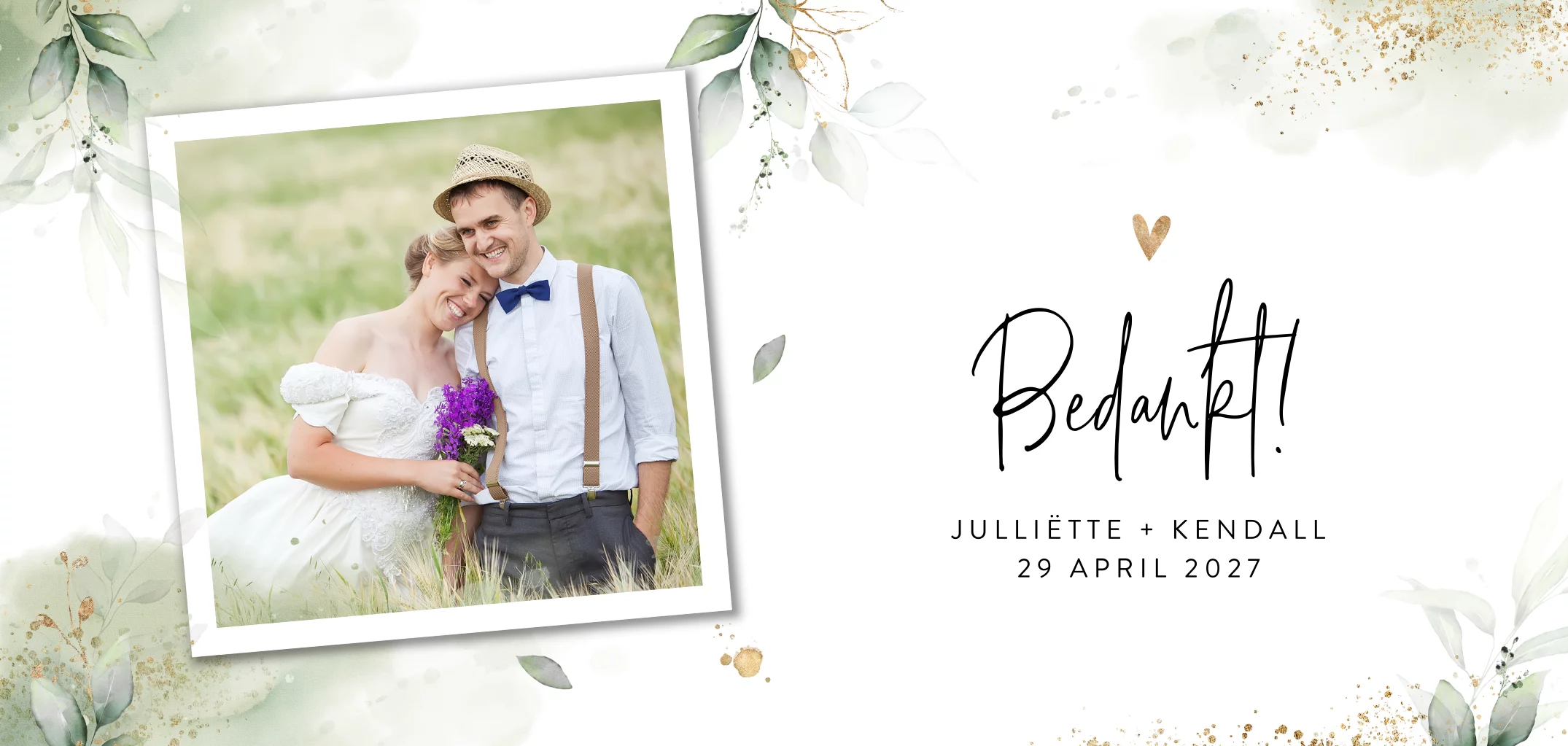 Mooie bedankkaart met groene waterverf en sierlijke bladeren met goudkleurige accenten. Met een stijlvol en trendy lettertype staat er groot 'Bedankt' op de kaart. In het witte kader is ruimte voor een mooie foto. Op de achterzijde kun je een persoonlijke boodschap voor alle gasten kwijt.