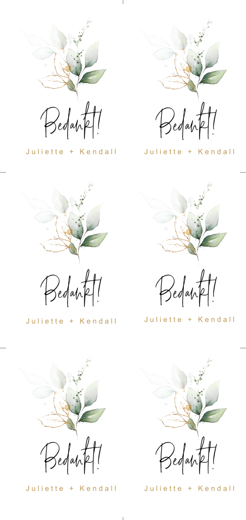 Mooie DIY labels met waterverf bladeren en 'Bedankt' in sierlijke letters. Je kunt de labels los knippen of snijden. Daarna kun je ze aan jullie bedankjes hangen om jullie gasten te bedanken voor hun aanwezigheid op jullie trouwdag.