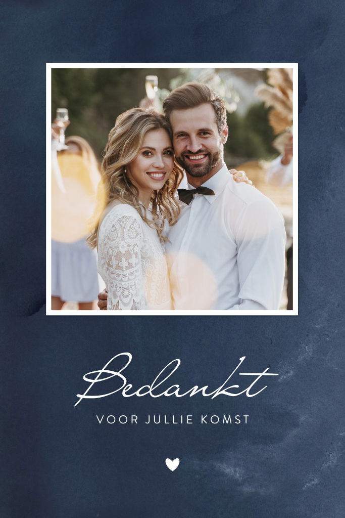 Op zoek naar een stijlvol kaartje om jullie gasten te bedanken voor de prachtige dag? Ga voor dit donkerblauwe ontwerp met eigen foto en goudfolie details. Donkerblauw met goud is altijd een goede combinatie! Deze bedankkaart past perfect bij onze trouwkaart 'Donkerblauwe trouwkaart met lijntekening van handen in goudfolie'.