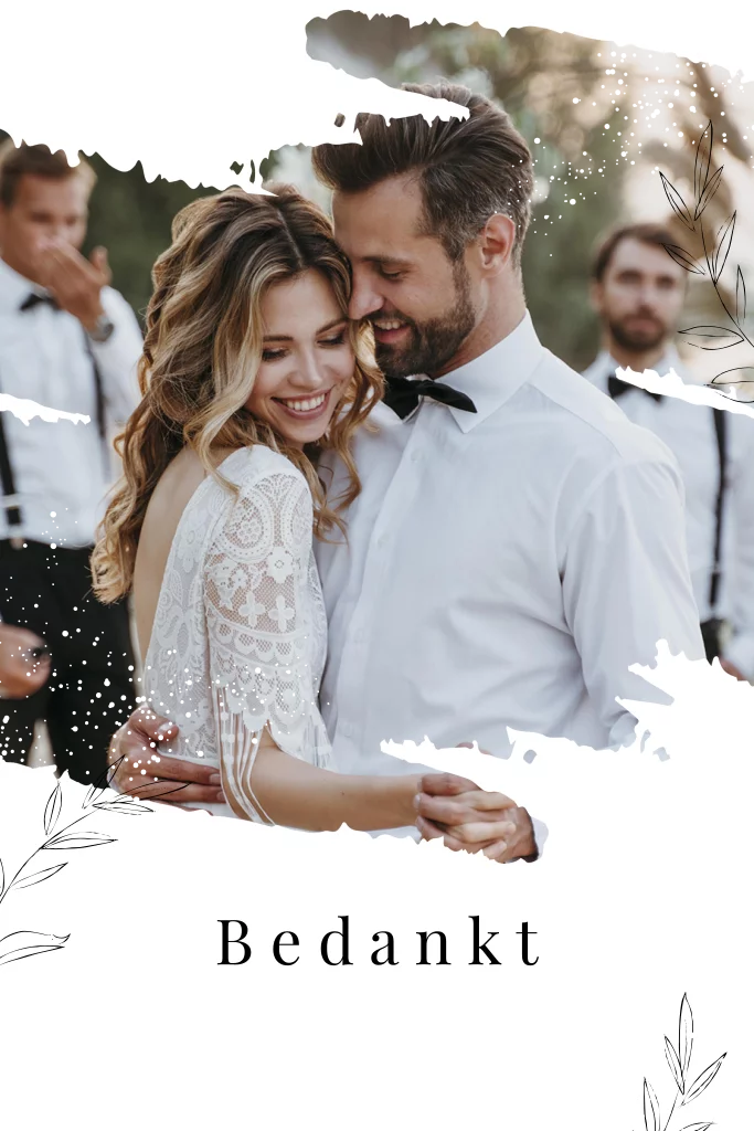 Mooie bedankkaart met grillig fotokader, getekende blaadjes en goudfolie spetters. Een chic kaartje om jullie gasten te bedanken voor de geweldige dag! Op de achterzijde van dit enkele kaartje is ruimte voor nog een mooie foto en een korte tekst. Pas deze bedankkaart zelf aan in onze ontwerptool.