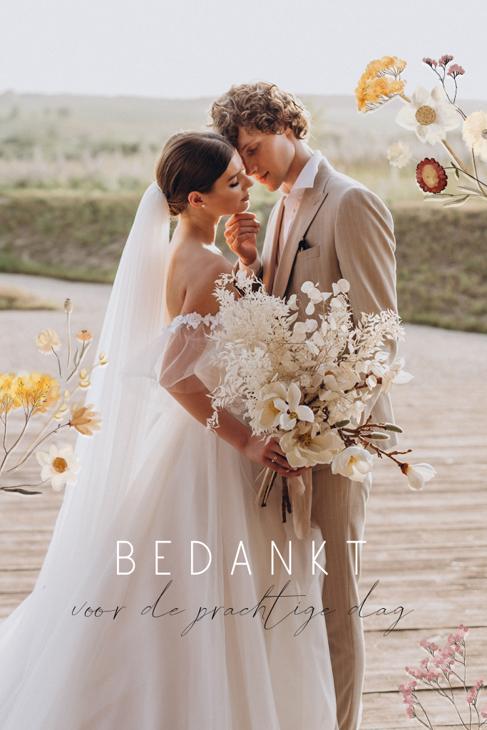 Mooie foto bedankkaart om jullie gasten te bedanken voor hun aanwezigheid tijdens jullie trouwdag. Vervang de foto met een eigen foto van jullie als bruidspaar om deze kaart te personaliseren. De getekende bloemen maken dit tot een romantisch kaartje. Deze bedankkaart past goed bij onze trouwkaart 'Beige trouwkaart met wilde bloemenkrans'.