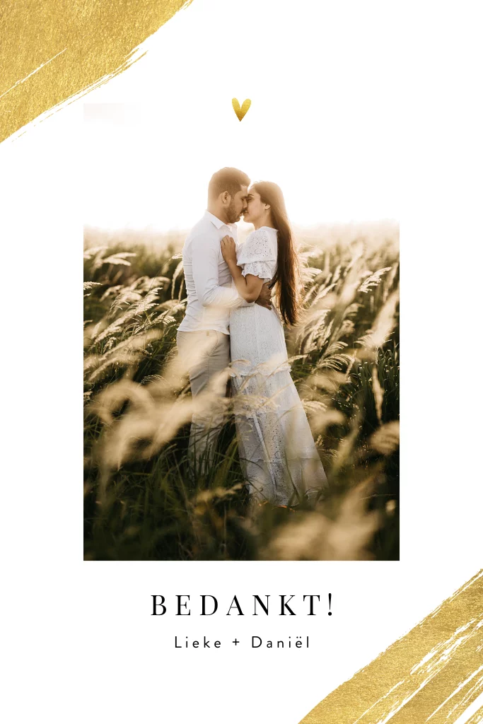 De mooiste dag van je leven zit er op en wat was het een feest. Het is natuurlijk extra leuk om al je gasten te bedanken met een stijlvolle bedankkaart. Voorop de bedankkaart met goudkleurige verfstreken staat een fotokader waar je een mooie foto van jullie trouwdag kan plaatsen. Stuur deze kaart naar familie, vrienden en bekenden die op jullie trouwdag aanwezig waren.