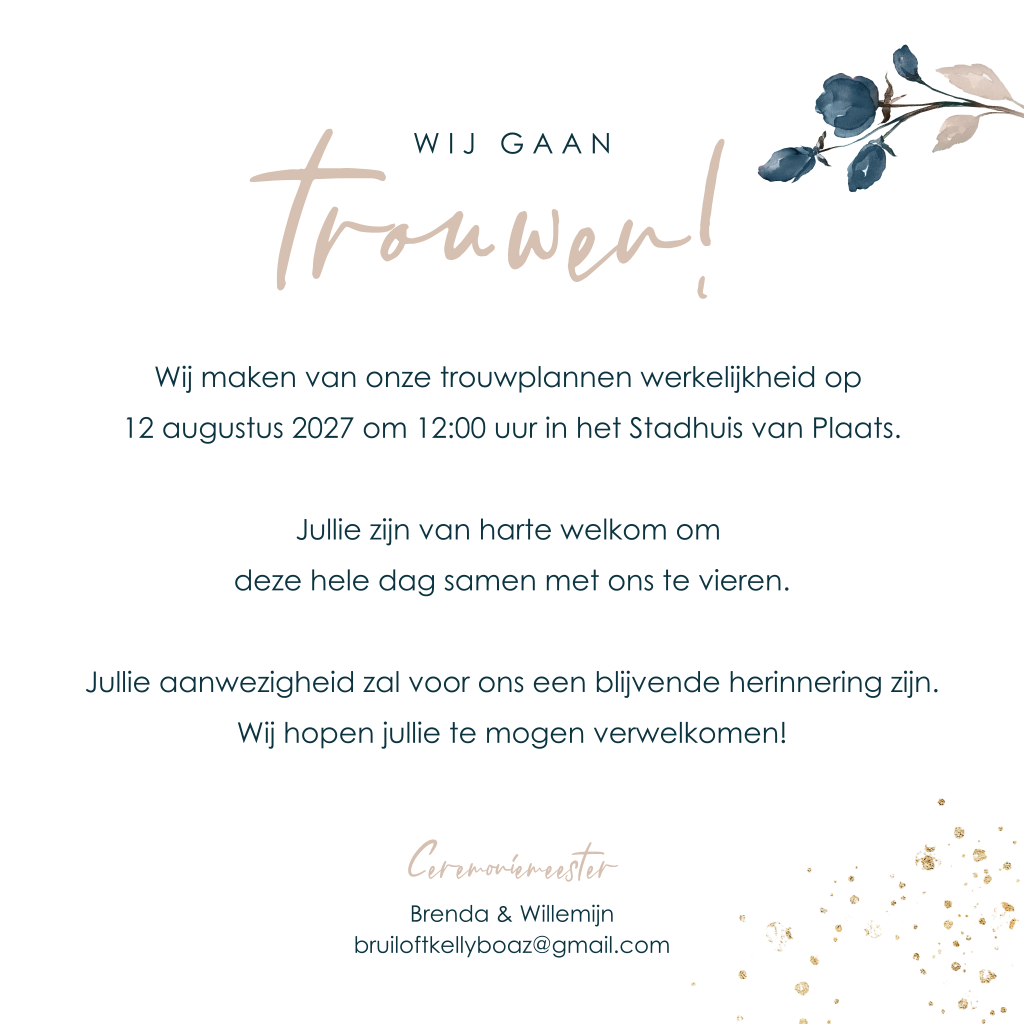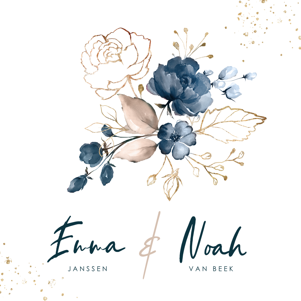 Ben je gek op bloemen? Deze chique trouwkaart heeft voorop een boeket met blauwe en roze waterverf bloemen. In het boeket zitten ook gouden accenten voor een moderne en hippe uitstraling. Pas de kaart zelf eenvoudig aan in de designtool en bestel een drukproef zodat je de trouwuitnodiging eerst in het echt kunt zien en goed kunt nalezen.