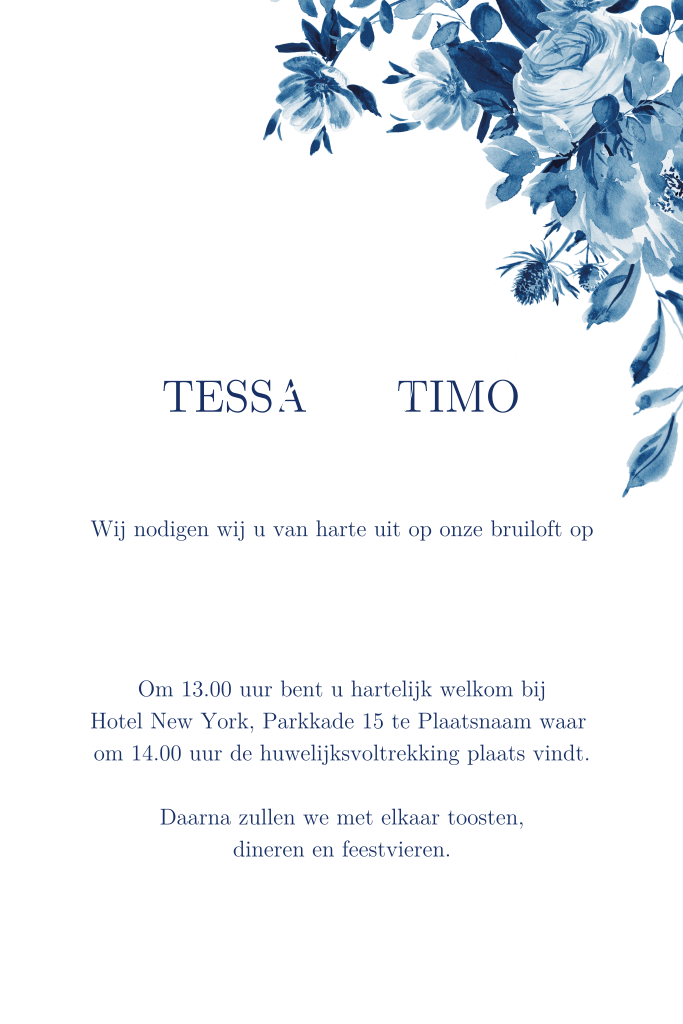 Delfts blauwe trouwkaart met krans met grote geschilderde blauwe bloemen rondom jullie namen. Bepaalde details zoals het &-teken en de tekst 'Wij gaan trouwen' zijn afgewerkt met goudfolie. Aan de binnenzijde van de trouwkaart is ruimte voor de tekst. Maak de kaart verder naar wens af en bestel een mooie drukproef om alvast van het eindresultaat te genieten.