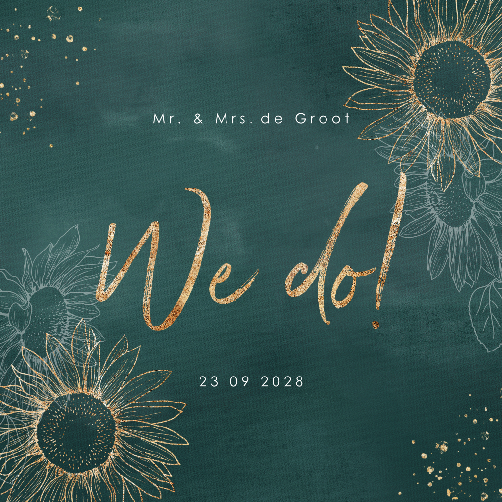 Donkergroene trouwkaart met zonnebloemen en spetters