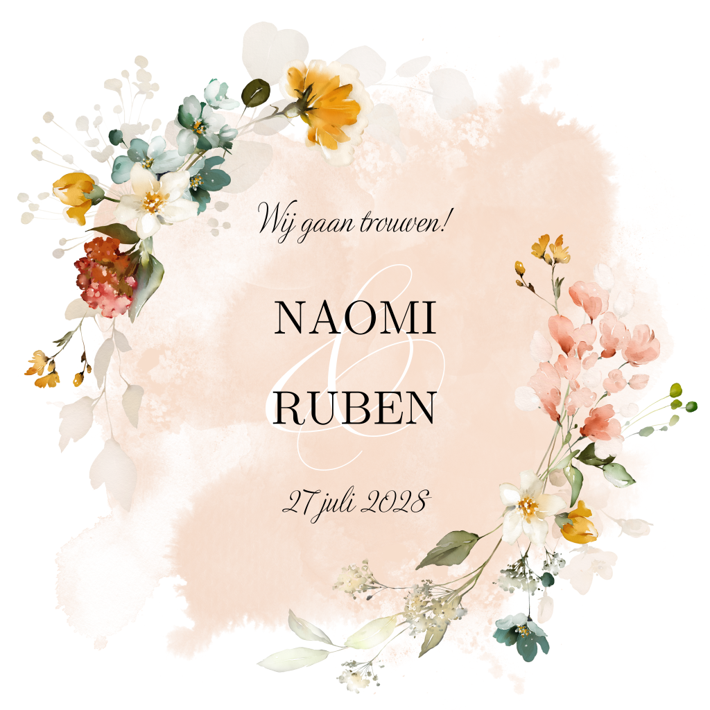 Klassieke trouwkaart met diverse kleurrijke waterverf bloemen. Voor de mooiste dag van je leven zoek je natuurlijk een feestelijke trouwkaart. Dit klassieke ontwerp met bloemen en zalmroze waterverfvlek pas perfect bij een bruiloft in de lente of zomer. Pas de kaart naar eigen inzicht aan.