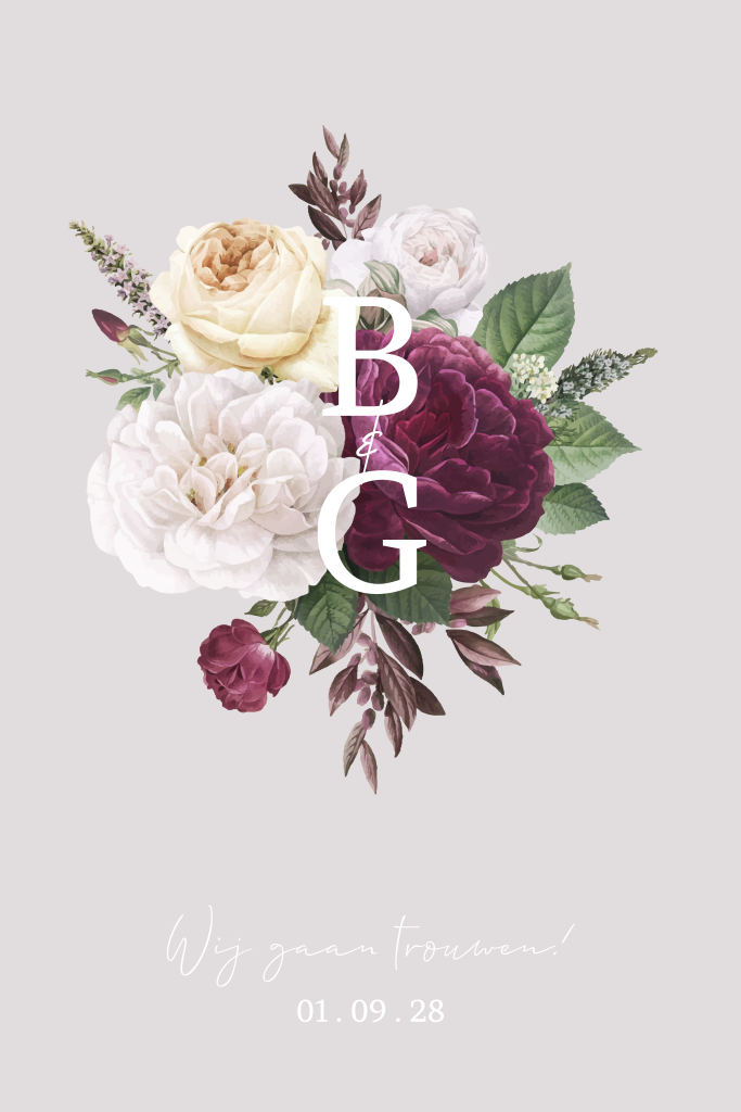 Hollandse bloemen. Jullie initialen zijn in goudfolie gedrukt, dit geeft een mooie luxe uitstraling. Op de achterkant van deze trouwkaart is ruimte voor verdere informatie over jullie trouwdag. De afgeronde hoeken geven dit kaartje net dat beetje extra. Pas dit ontwerp zelf aan in onze handige editor. Voor nog meer trouwkaarten met bloemen klik hier.